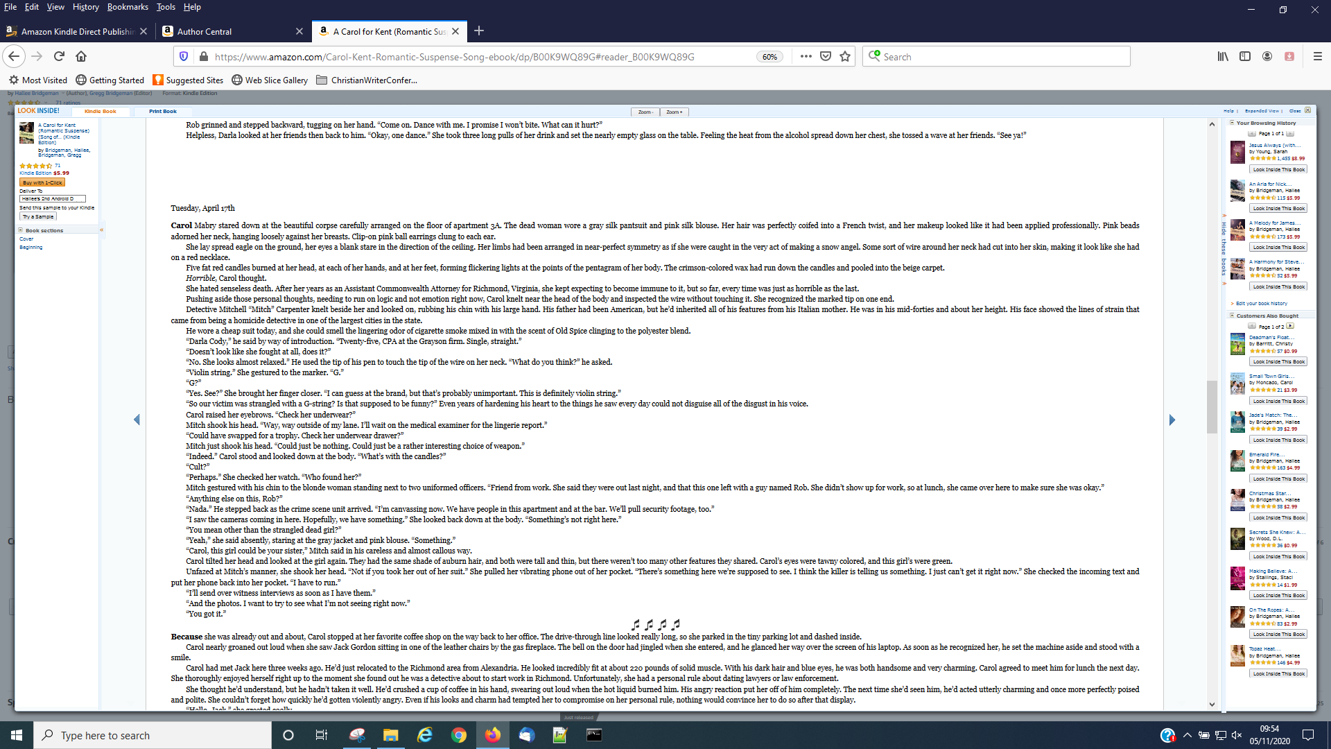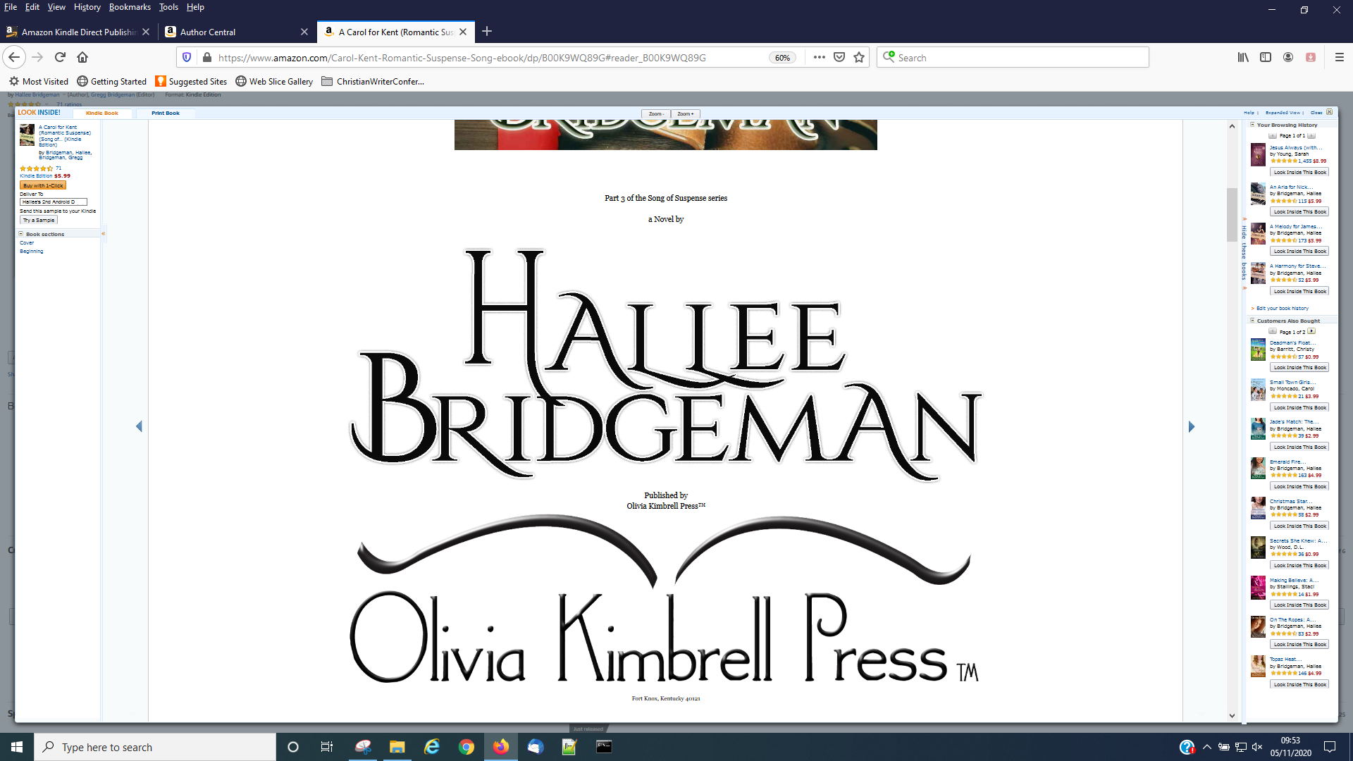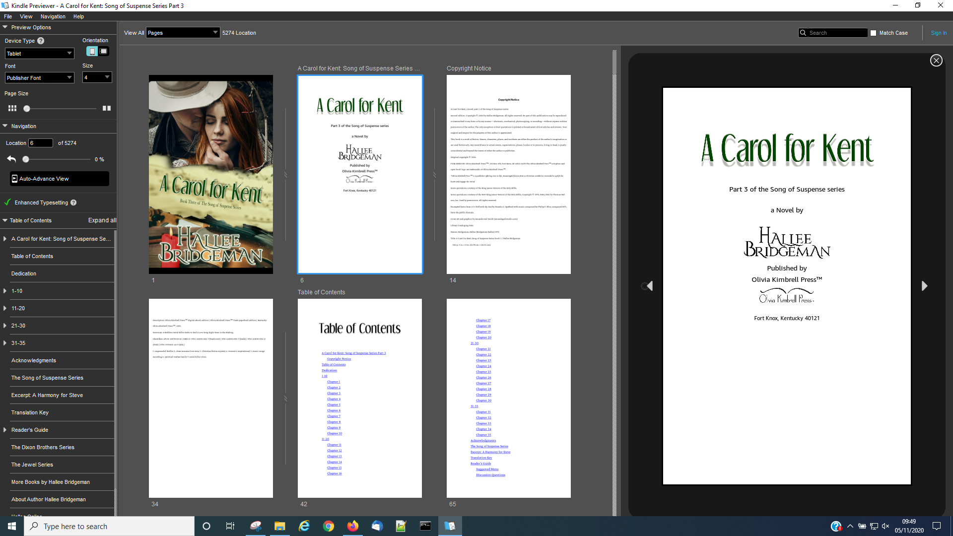 For testing, I will either use KindleGen or KindlePreviewer to ensure quality. The last series of books I uploaded I noticed that though the SVG formatted images and embedded fonts render perfectly in KindlePreviewer and via the KDP previewer, when you access the "Look Inside" feature on the book's product page, the SVG images do not properly render, nor do any embedded fonts. I suspect this is because the "Look Inside" previewer is unable to handle HTML5. Has anyone else encountered this? I have reported the issue to Amazon but I am not holding my breath. (Attachments are screenshots in each of the various previewers. Note that the book title, in this case "A Carol for Kent" is an SVG image and the cursive font is embedded for the letter at the beginning of Chapter 1.) |