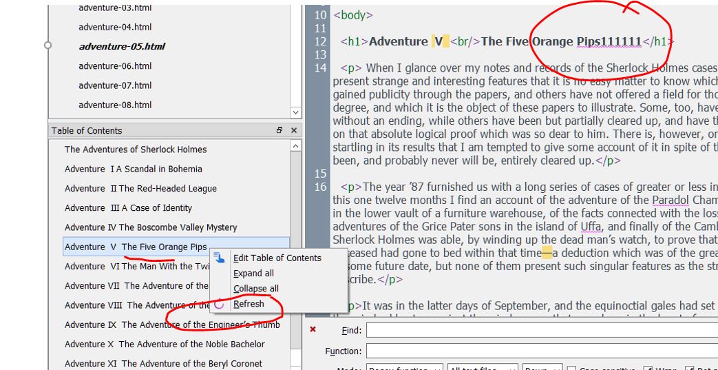 Agree that it should not ignore words in quotes (wasn't exactly what I meant) However, it works differently if Smarten Punctuation has been run, since while it handles a leading ASCII 34 correctly, leading curly quotes have a different result (Before-Quotes.jpg and After-Quotes.jpg) https://manual.calibre-ebook.com/edit.html#id18 2. When I do the above from the User Manual to get the green line and right click (TOC.jpg) I get options to [Reload], [Save Page], and [View Page Source], but I can't get anything to happen when I click them. I was expecting that [View Page Source] would open the edit window to that point 3. TOC View (TOC View.jpg) does link to the edit window which conveniently allows me to fix/change the TOC source, but it's not clear what [Refresh] does. [Edit] does open the TOC editor and I can rebuild/refresh using that |