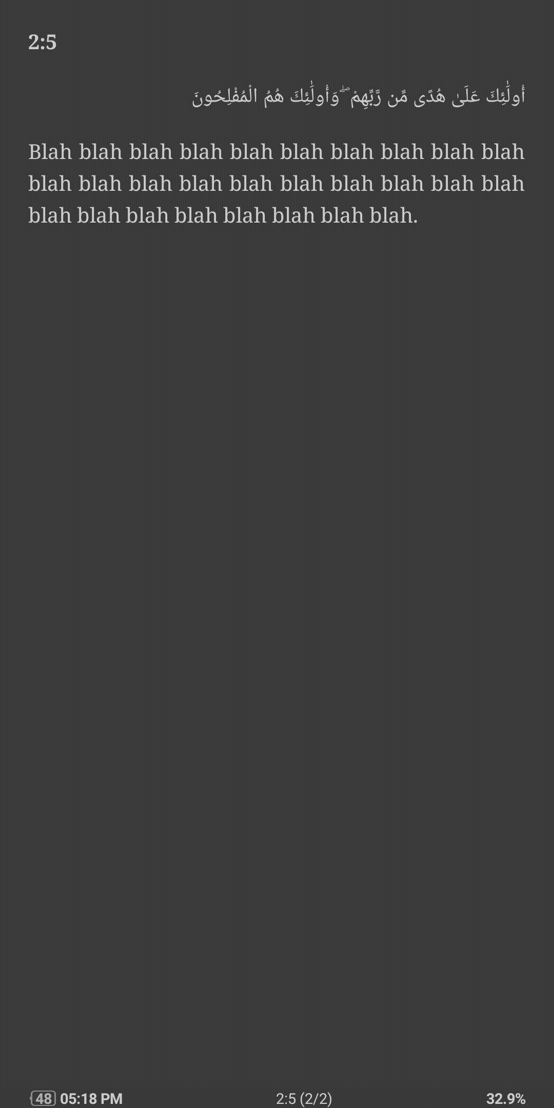 <?xml version="1.0" encoding="utf-8"?> <!DOCTYPE html> <html xmlns="http://www.w3.org/1999/xhtml" xmlns:epub="http://www.idpf.org/2007/ops"> <head> <title></title> <link href="../Styles/Style0001.css" type="text/css" rel="stylesheet"/> </head> <body> <h1>Blah blah blah blah blah blah<br/> سورة البقرة </h1> <h4 id="sigil_toc_id_1">2:1</h4> <p class="rtltext"> الم </p> <p>Blah blah blah blah blah blah blah blah blah blah blah blah blah blah blah blah blah blah blah blah blah blah blah blah blah blah blah blah.</p> <h4 id="sigil_toc_id_2">2:2</h4> <p class="rtltext"> ذَٰلِكَ الْكِتَابُ لَا رَيْبَ ۛ فِيهِ ۛ هُدًى لِّلْمُتَّقِينَ </p> <p>Blah blah blah blah blah blah blah blah blah blah blah blah blah blah blah blah blah blah blah blah blah blah blah blah blah blah blah blah.</p> <h4 id="sigil_toc_id_3">2:3</h4> <p class="rtltext"> الَّذِينَ يُؤْمِنُونَ بِالْغَيْبِ وَيُقِيمُونَ الصَّلَاةَ وَمِمَّا رَزَقْنَاهُمْ يُنفِقُونَ </p> <p>Blah blah blah blah blah blah blah blah blah blah blah blah blah blah blah blah blah blah blah blah blah blah blah blah blah blah blah blah.</p> <h4 id="sigil_toc_id_4">2:4</h4> <p class="rtltext"> وَالَّذِينَ يُؤْمِنُونَ بِمَا أُنزِلَ إِلَيْكَ وَمَا أُنزِلَ مِن قَبْلِكَ وَبِالْآخِرَةِ هُمْ يُوقِنُونَ </p> <p>Blah blah blah blah blah blah blah blah blah blah blah blah blah blah blah blah blah blah blah blah blah blah blah blah blah blah blah blah.</p> <h4 id="sigil_toc_id_5">2:5</h4> <p class="rtltext"> أُولَٰئِكَ عَلَىٰ هُدًى مِّن رَّبِّهِمْ ۖ وَأُولَٰئِكَ هُمُ الْمُفْلِحُونَ </p> <p>Blah blah blah blah blah blah blah blah blah blah blah blah blah blah blah blah blah blah blah blah blah blah blah blah blah blah blah blah.</p> <h4 id="sigil_toc_id_6">2:6</h4> <p class="rtltext"> إِنَّ الَّذِينَ كَفَرُوا سَوَاءٌ عَلَيْهِمْ أَأَنذَرْتَهُمْ أَمْ لَمْ تُنذِرْهُمْ لَا يُؤْمِنُونَ </p> <p>Blah blah blah blah blah blah blah blah blah blah blah blah blah blah blah blah blah blah blah blah blah blah blah blah blah blah blah blah.</p> <h4 id="sigil_toc_id_7">2:7</h4> <p class="rtltext"> خَتَمَ اللَّهُ عَلَىٰ قُلُوبِهِمْ وَعَلَىٰ سَمْعِهِمْ ۖ وَعَلَىٰ أَبْصَارِهِمْ غِشَاوَةٌ ۖ وَلَهُمْ عَذَابٌ عَظِيمٌ </p> <p>Blah blah blah blah blah blah blah blah blah blah blah blah blah blah blah blah blah blah blah blah blah blah blah blah blah blah blah blah.</p> <h4 id="sigil_toc_id_8">2:8</h4> <p class="rtltext"> وَمِنَ النَّاسِ مَن يَقُولُ آمَنَّا بِاللَّهِ وَبِالْيَوْمِ الْآخِرِ وَمَا هُم بِمُؤْمِنِينَ </p> <p>Blah blah blah blah blah blah blah blah blah blah blah blah blah blah blah blah blah blah blah blah blah blah blah blah blah blah blah blah.</p> </body> </html> Last edited by d351r3d; 06-03-2020 at 10:03 AM. |