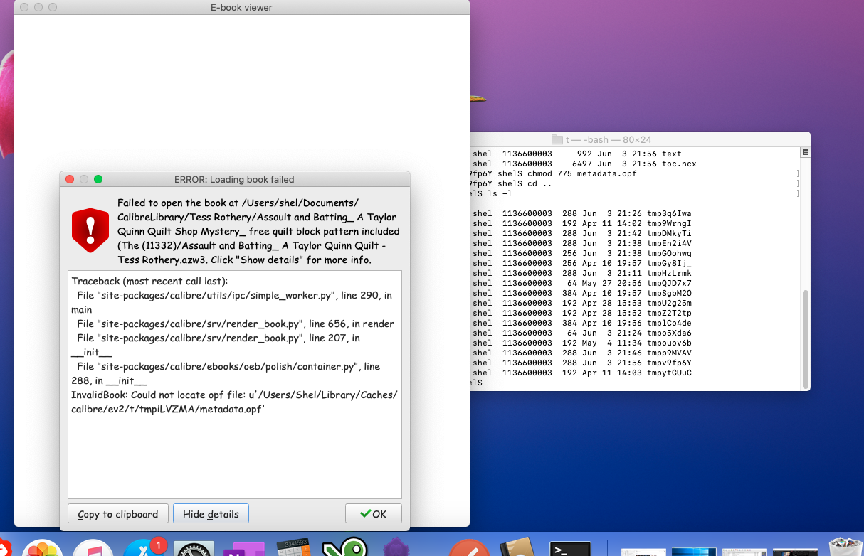I'm running a Mac Mini, with Catalina. I can't get any of my ebooks to open in the viewer. A screenshot of the error is below. It appears that the problem is permissions, but even Chris the genius IT husband couldn't figure out why it's happening. I did update to the latest version of calibre, no luck. This has been happening for several versions/updates, it just now got to be a big enough nuisance for me to try to diagnose the problem. "The metadata.opf goes into Library/Caches/calibre/ev2/t/tmp****** with permissions of 700. Nothing else is accessing it, lsof comes up empty on metadata.opf and everything above it. ps -ef comes up with nothing as well. If it is supposed to have something other than 700 permissions (and that shouldn't matter anyway unless Calibre is running as something other than $USER) why are cache files being created that Calibre itself should be able to access but can't?" |