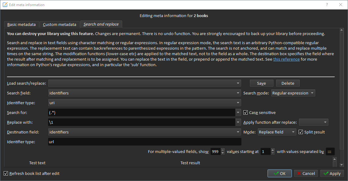| Using Search & Replace with Identifiers field | BookJunkieLI | Calibre | 6 | 11-13-2012 02:20 PM |