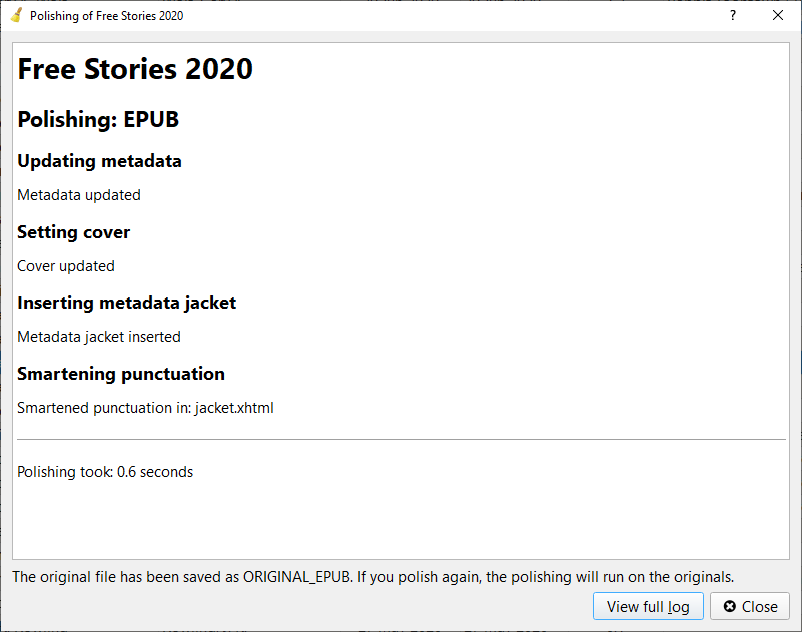 I used the Polish Tool, I selected "Update Metadata in the book file", I saved the settings, but there was no metadata when I saved the book to disk. What am I missing? I have to admit that my skills at Calibre are very basic. I searched for ModifyEpub plugin but was not able to locate that. My apologies, once again for not follwing your instructions. Best wishes mamaijee |