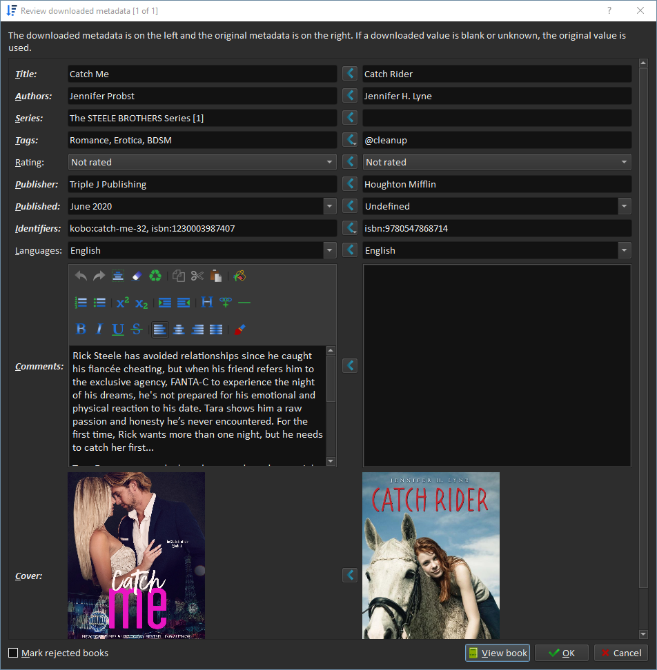The other 3%, though...I sometimes get eBooks (usually lacking ISBNs) where, for some reason, it selects an entirely different book with a vaguely similar title and/or author name even though the actual book is available as an exact match. ![]() I can use the individual metadata download dialog to choose the right book, but as far as I can tell 'review metadata' isn't an option there. Is there any way around this? |
