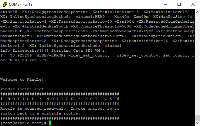 run bootcmd_FB bootm 0xE41000 Back to your kindle screen. Choose Reboot or Disable Diags then Exit to login prompt On PuTYY screen, input username and password login: root password: fionaxxx (as you remember on the first step) Edit the password file, input below code: Code: