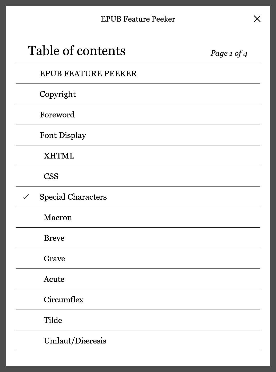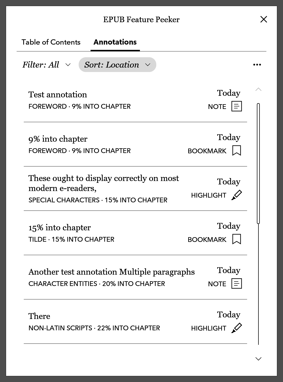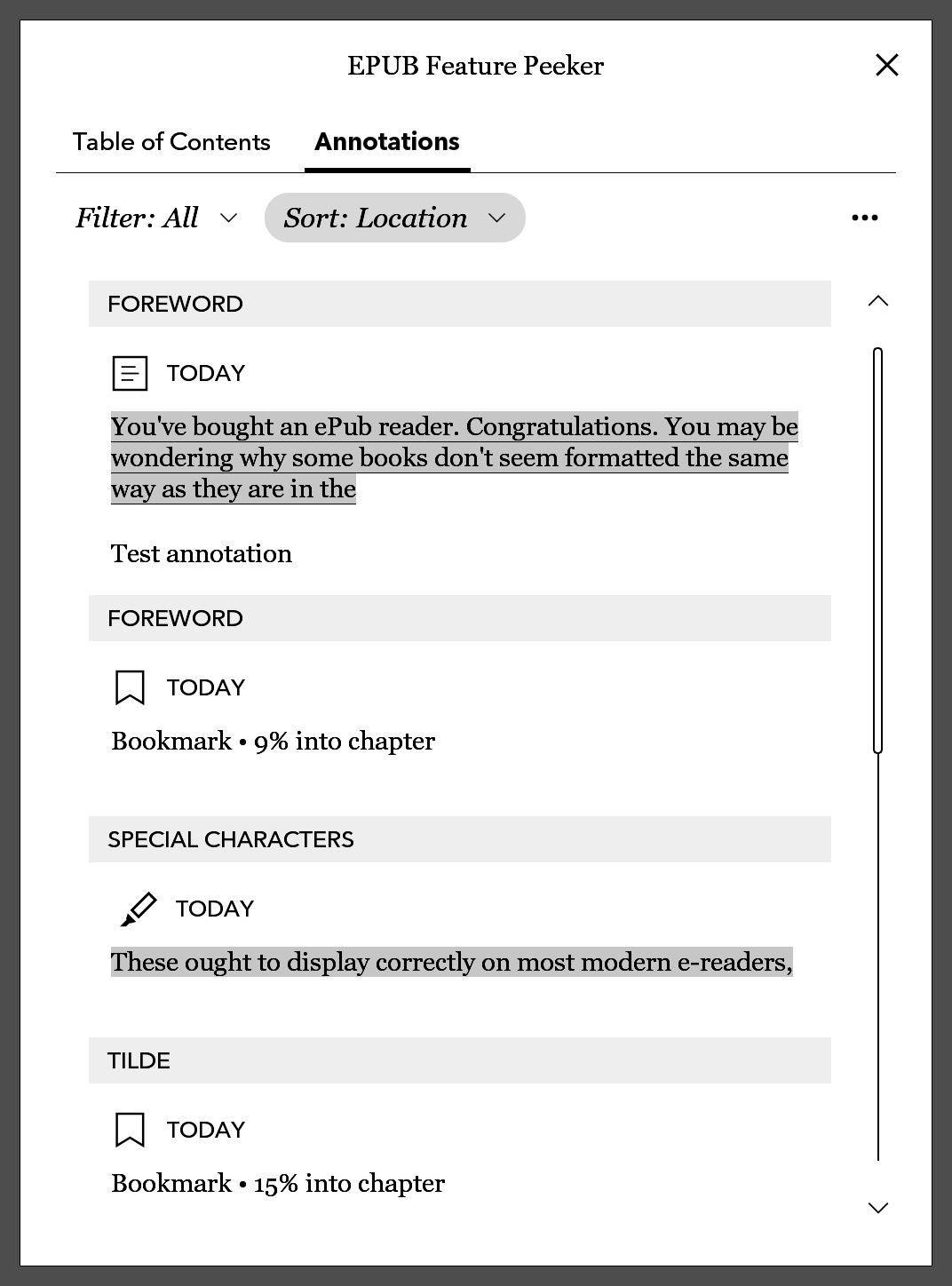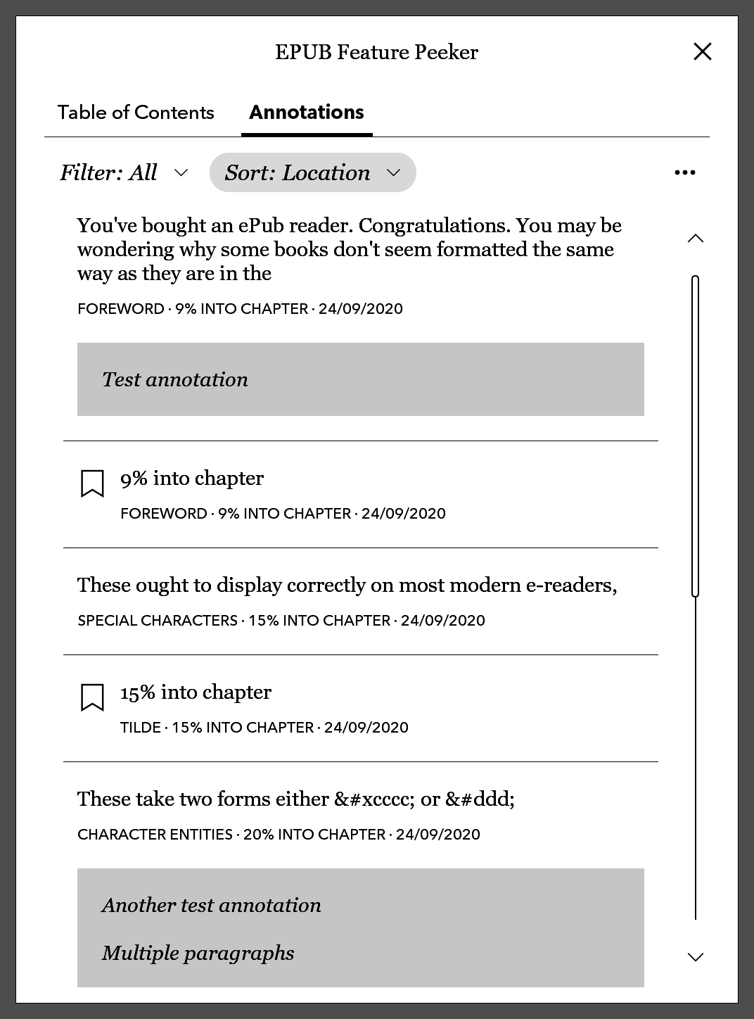 I've decided to not show the dictionary selection menu, but the new dictionaries are present! What I will show are the new TOC and annotations views. In order to not risk copyright infringement, and because the book I'm currently reading contains tons of spoilers, I'll be using the "EPUB Feature Peeker" that user DomesticExtremis created a while back to demonstrate. I realised I forgot to capture screenshots of the old view with the aforementioned 'book' before updating my Clara HD (as I originally wanted to capture it with the book I was currently reading), so I'll patch in those missing screenshots from my Glo HD. However, the former has had a config file change to make it use UK date formats, while the latter is still using US date formats that are used with the regular "English" UI language option, so that should explain why the date formats are different. Here's the new "Table of contents" view! Just like with the library and store views in firmware 4.23, the "Go to" option is gone! (an example can be seen in my post for firmware 4.23 pre-revision) In the old view, the current chapter was indicated with a tick (or checkmark in US English), but in the new view, it's instead indicated with bold text. The icons in the new "Annotations" view are larger. Here's the "List view". Here's the "Notebook view". The menus you get when tapping and holding remain the same, so does the view when tapping on a note in the "list" view. There's a new "Notebook (beta) option, but I already see some visual bugs in that, however, I'll still show them here. Bugs in this new beta view include the chapter name being repeated for every annotation. Tapping on an annotation works just like the current "Notebook" view, in which it takes the user to the page the annotation is on. Last edited by MustardOrMayo; 09-23-2020 at 10:41 PM. |