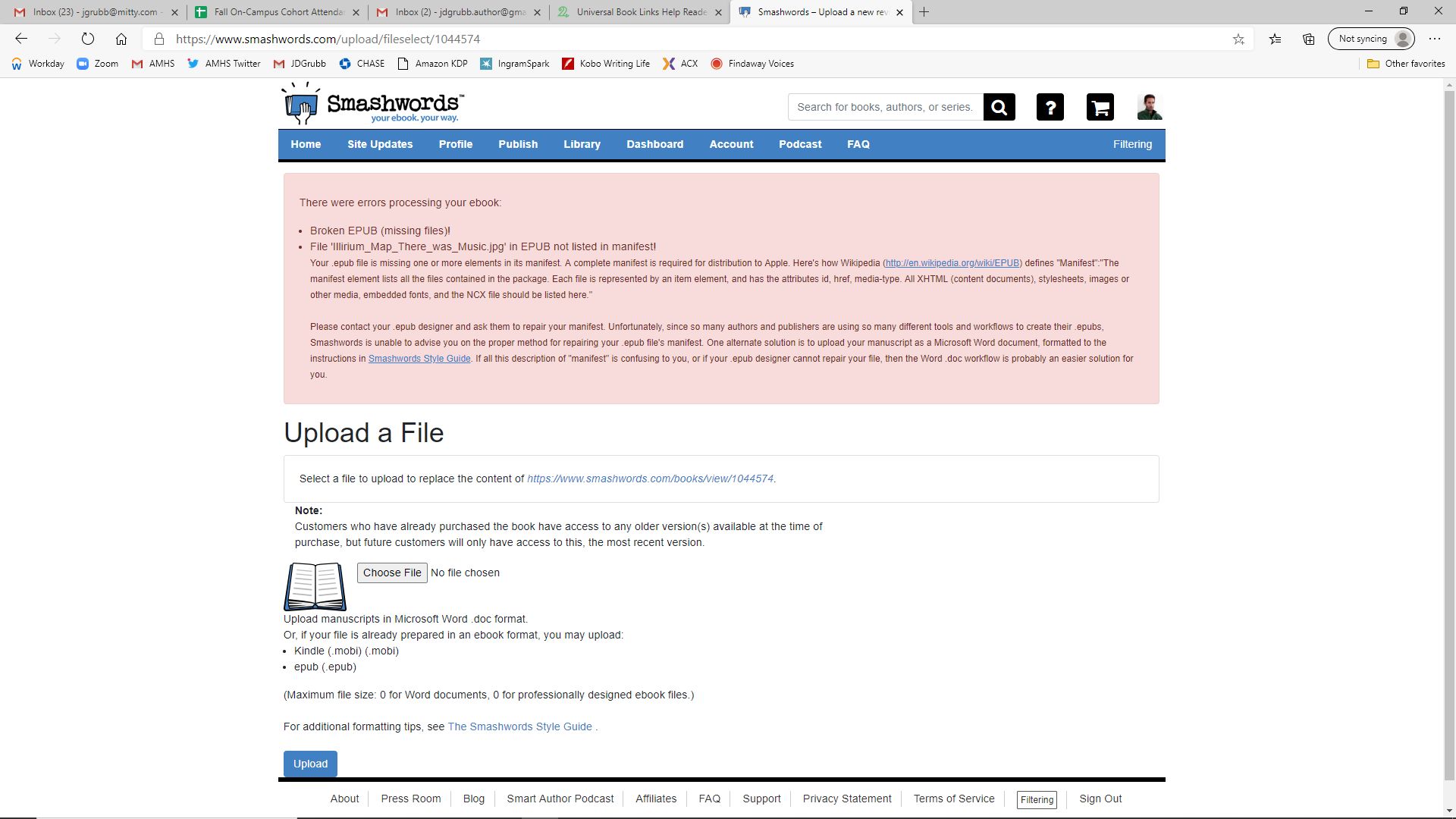 I keep getting an error message when I try to upload my EPUB file on Smashwords: "File 'Illirium_Map_There_was_Music.jpg' in EPUB not listed in manifest! Your .epub file is missing one or more elements in its manifest. . . ." After extensive review, and scouring the internet for troubleshooting solutions, I cannot figure out how to resolve this. I have run the EPUB through another EPUB Validator, which finds no errors (see attached screenshot), and reviewed the manifest manually using Calibre (via the content.opf listing - see attached screenshot), which shows the image in question as part of the manifest - with consistent naming. Moreover, the files are clearly listed in the directory, and no other aggregator site has raised this problem with the exact same EPUB file. Smashword Response, Part 1 I contacted the Smashword Service Team, and using my actual EPUB file, a member reviewed it with their tech team. He responded: "I had our techies take a look at the EPUB and they suspect it's due to the formatting of the underlying HTML for that particular file in your EPUB manifest. Specifically, they suspect it's due to the "../" in the HTML for the file in question: <item id="id1" href="../Illirium_Map_There_was_Music.jpg" media-type="image/jpeg"/> By contrast, your other elements include the exact directories, e.g.: <item id="image_cover" href="Images/d84614660b3bc605c904b4cb49ac72bc55c6934e_smallRaw. jpg" media-type="image/jpeg"/> <item id="content_8_part-2-wilderness" href="Text/8_part-2-wilderness.xhtml" media-type="application/xhtml+xml"/> Updating the href attribute to explicitly include the entire directory will likely fix the issue. Question about Calibre I originally entered that image using Calibre, while the rest of the EPUB was generated by Reedsy, the former took the complete file name "Illirium_Map_There_was_Music" and added the ".../" preceding it for some reason. I've tried removing and re-adding the image file a couple times, but the same result occurs. Trying to edit the ePUB manually, I do not appear to be able to change the registry listing (i.e. removing the ".../") without creating a link error within the EPUB, which removes the image. Smashword Response, Part 2 Inquiring further about this, the representative responded: You'll need to move the image out of the root directory into the oebps directory, and update the link to the image everywhere it's used through out the book as well as the manifest. Lingering Question Does anyone know how to do this, if that is indeed the problem? Or is there something else I am missing? Again, this error has not come up with any other eBook aggregator. Thank you very much for your time and help. |