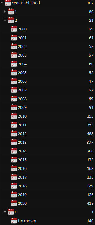 I might be able to add partitioning first letters, combining first letters to ensure that the number of items in the combination is at least X, giving what you suggested in your fourth paragraph. Your edit suggests doing different combinations depending on the field, which I am not willing to attempt. If 'Year Published' is a composite column then I think you can solve your problem by making it hierarchical with the first level being the first 3 digits of the year followed by a zero, then '.' then the actual year. Examples: 2010.2015, 2010.2018, 2000.2006. |
