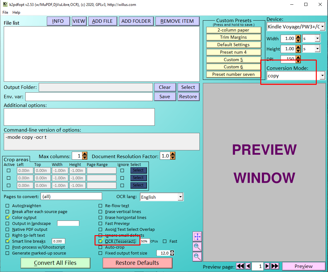 With the MS Windows GUI you can set them as shown in the attached screen shot. The OCR option will automatically turn off native mode.