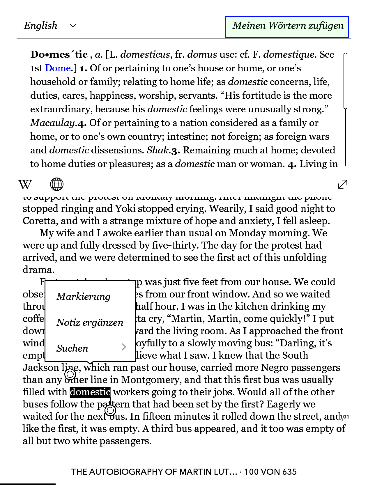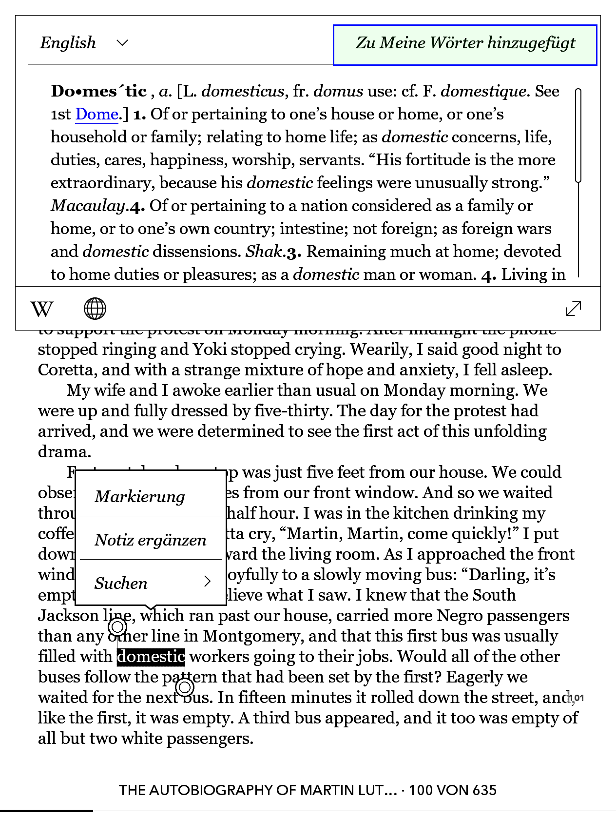 I think the button to actively add it to 'myWords' is even preferable to the Kindle variant, back there I had a lot of false positive cards just as I accidentally marked words from time to time. ... so I had to burry these flash-cards later on the mobile device. To make it perfect it would be great to have a reference to the real text-position where the word occurred in the book. I really love to see a real quote, ... real context of my real reads when learning cards. But eventually I can patch that with a search in the referenced book when I produce the feed for the cards. To start with, a simple fuzzy search should bring a similar feature. Last edited by lordeagle; 11-26-2020 at 12:30 PM. |