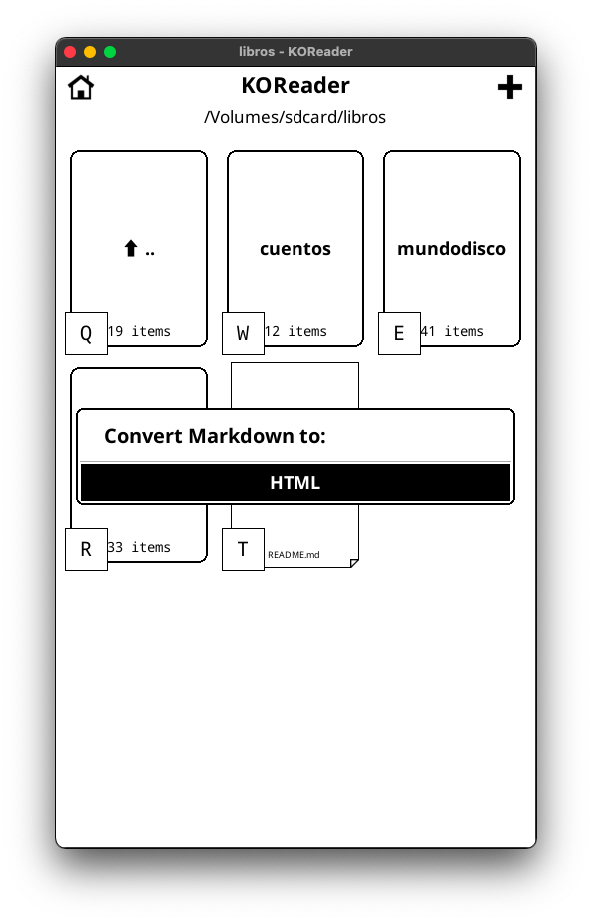 Each type of document can be opened with one or more "viewers". I'm quoting viewers because they can be whatever, from simple things built on top of available widgets (like htmlboxwidget.lua) to wrappers to full engine backends like crengine, mupdf or djvulibre. "Viewers" share in common that they need to be added to a documentRegistry, so the program knows which type of files a given viewer supports. In the case of markdown files, there're currently 2 "viewers": CREngine and the text editor plugin (see attachments). You can wrap you own widget based on htmlboxwidget and handle md documents with it. In that case you can do conversion on the fly, without storing the html in a cache file. That should work for little files, but don't expect to convert the Bible in a Kobo Mini on the fly. ![]() My suggestion, if you go that route, is checking the file size of the document you want to render, doing on the fly conversion until a certain size and using a cache file for larger documents. Anyways, you can look at the code in https://github.com/koreader/koreader...ntend/document Have fun |