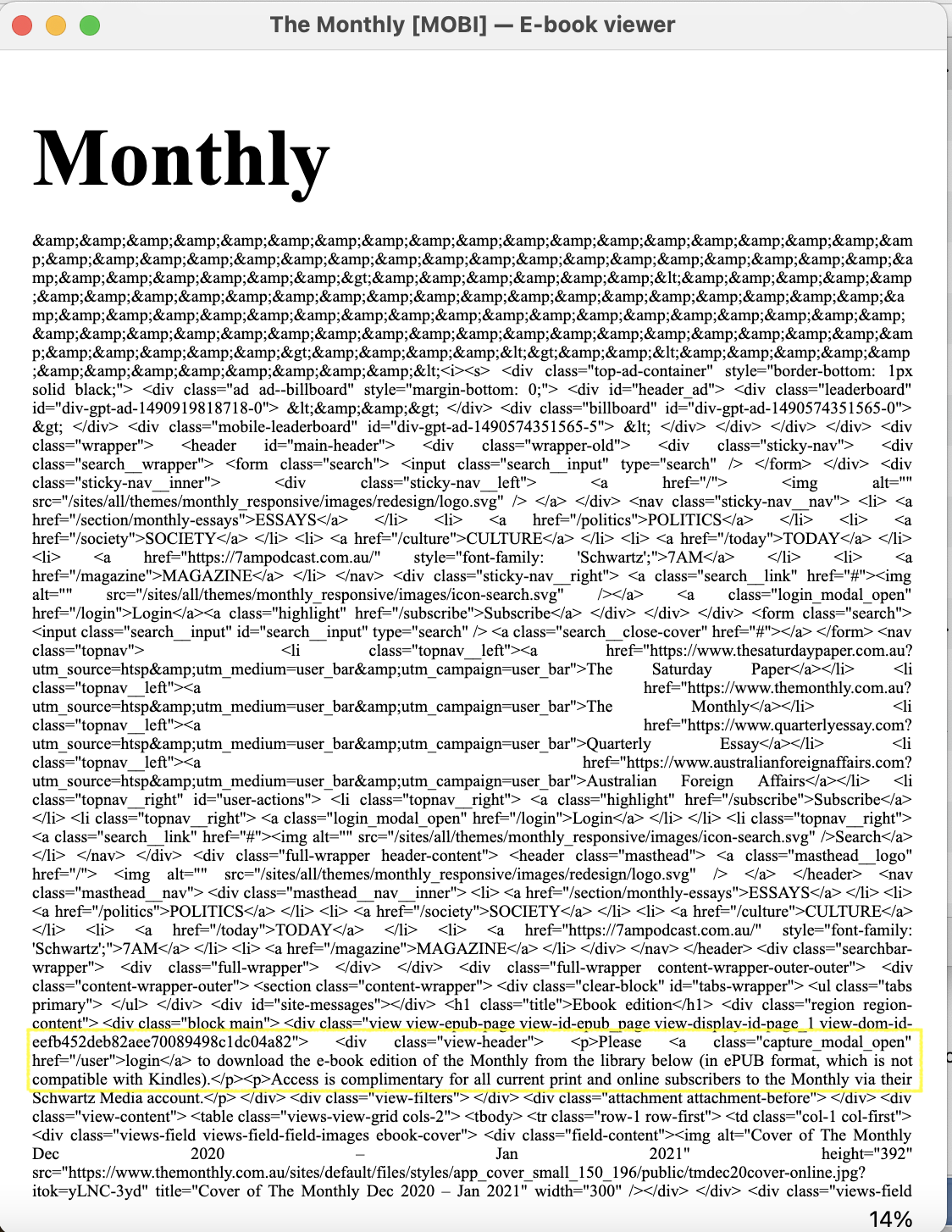 https://www.mobileread.com/forums/sh....php?p=3849639 Can someone tell me what "realm" should be - I think this is from the original taz digiabo code domain = "https://www.themonthly.com.au" url = domain + "/ebook/" auth_handler = HTTPBasicAuthHandler() auth_handler.add_password(realm='TAZ-ABO', uri=url, user=self.username, passwd=self.password) opener = build_opener(auth_handler) I think my highlight on the below shows I'm close to getting it to work, but the code is falling over somewhere, the output is as shown - a bunch of HTML, it doesn't seem to be logging in / finding the epub file. Any tips? Many thanks |