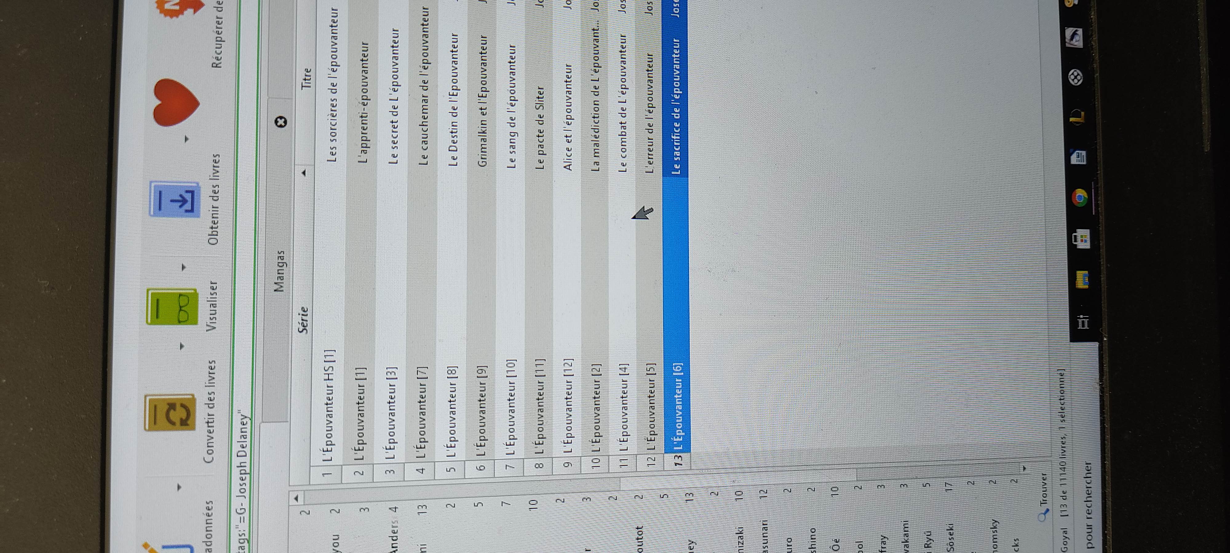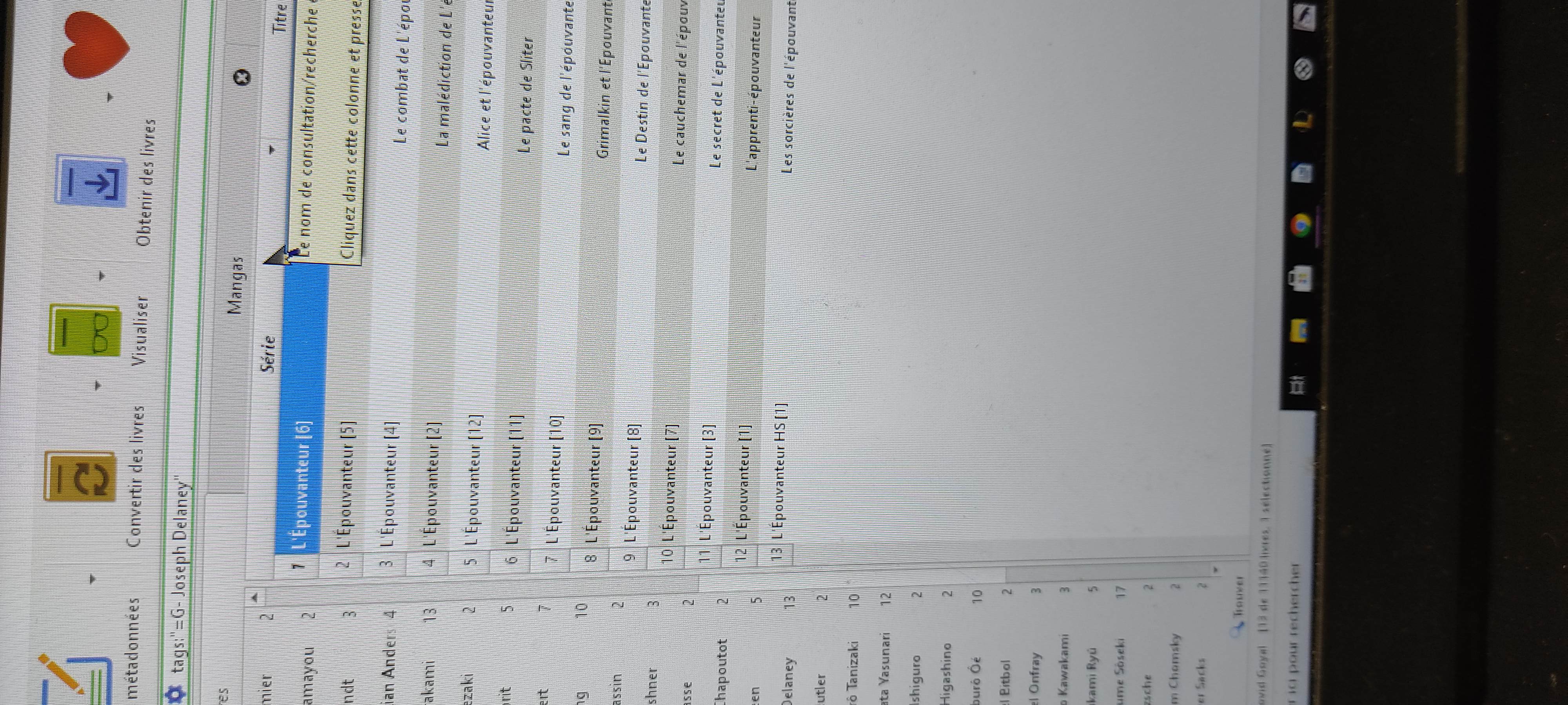 C'est la première fois que je vienne ici, je vous découvre en recherchant une solution à mon problème sur le moteur de recherche. N'ayant rien trouvé, j'espère que vous pouvez m'aider. Lorsque je clique la colonne "série" je m'attends que la liste sot organisée selon l'ordre logique mais non, je ne comprends pas pourquoi... Je joins la photo pour être plus claire. Un photo c'est dans le sens de l'ordre et une autre photo, le sens inverse. N"2,4,5,6 ne veulent pas être dans l'ordre correct. Pourtant le nom a bien été vérifié. Aucun de différence. Cela marche bien pour des autres séries mais expecte ça... Je vous remercie pour votre aide |