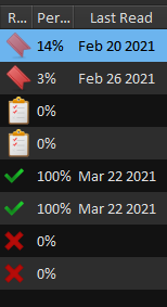Also I use a few extra columns (#lastread, #percentread, and a composite #currentlyreading) to display various column icons: Last edited by ownedbycats; 03-23-2021 at 06:05 PM. |