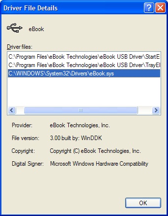If you go to your Control Panel, and double-click the System icon, then tap the Hardware tab, you will see a button labelled Device Manager. Click that, expand the Universal Serial Bus controllers entry and you should see that ebook item when your EBW1150 is connected (see "-pic1" below) If you see that ebook item, then double-click it to see the Properties and tap the Driver tab (it should then look like "-pic2", below). Ensure you have the right driver, if not, click the Update Driver button. You may also want to tap the Driver Details button to ensure you have the info as in "-pic3" below. However, if on that ebook item you notice a yellow exclamation point, then you must Uninstall the driver and then, WITHOUT the EBW1150 being connected, re-installed the ETI usb driver v3.00. Then when done, connect the EBW1150 and see if it works. If it didn't work, then can you install the ETI usb drvier v3.00 on another computer and verify that the EBW1150 and usb cable are functional? If not, you may need warranty service. Just post back here how far you get with the above. Last edited by nrapallo; 12-16-2008 at 08:15 AM. Reason: typo |