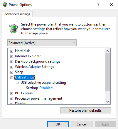 DrChiper, I looked but there isn't a USB option when I go to advanced power settings. I have only like 4 things listed there and none have a sub-section that is USB related either. Thanks though! |