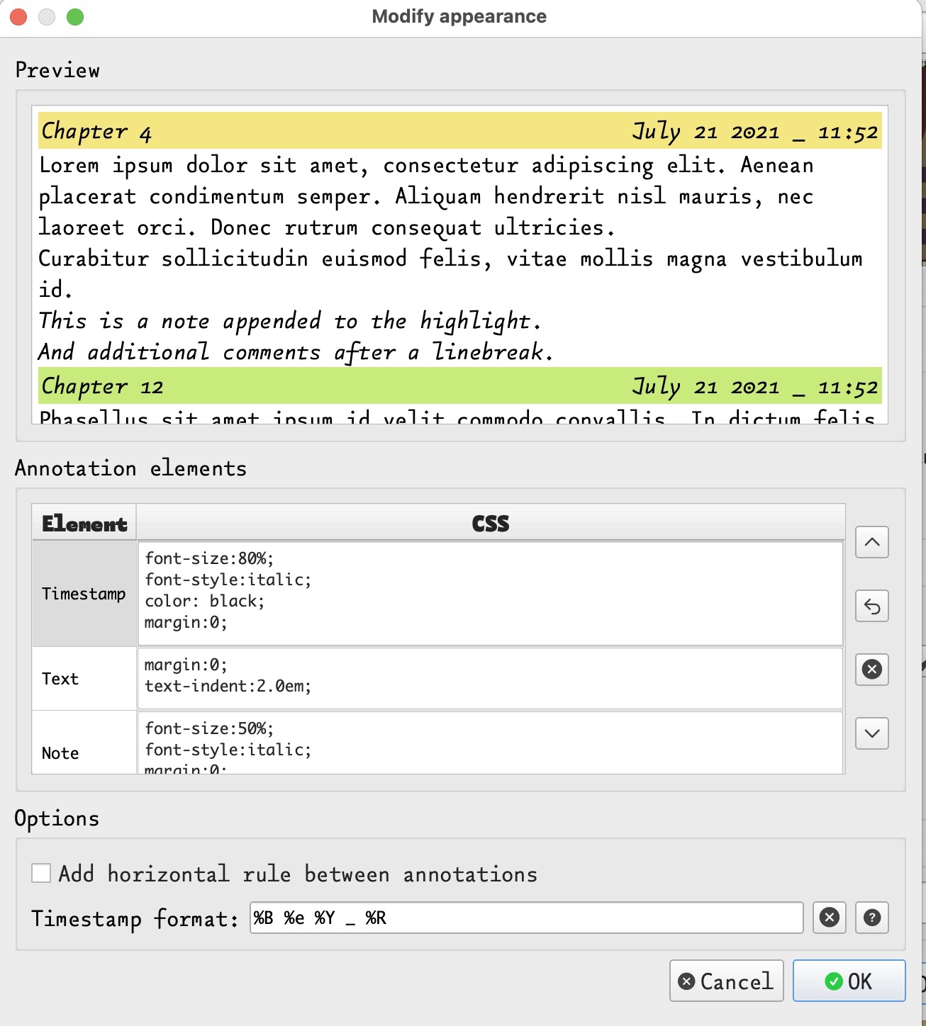 I would like to style the annotations that I have stored in Calibre. I know how to get them off the reader (Kobo Libra H20), and have deduced how to alter the timestamp, but I can't work out if there is a way that I can globally alter the way that it styles them. I currently have chapter headings and timestamp on a white (more like grey) bar, with the annotation below in plain text. I would like to know if there is a way to style the bar so it is a different colour (or cycles through colours, as Calibre seems to suggest [although I cannot now recall where]), or how to have a page number instead of a (sometimes long) chapter title each time. etc. blah. If anyone can help, I'd be chuffed.