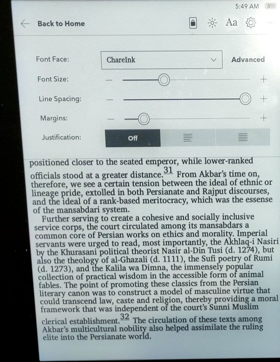 I removed the Store-bought kepub version of a book and sideloaded an epub instead, the same one I've been reading on my Libra using KOReader. It's a largish file, the retail kepub was 24MB, the epub 22, so in KOReader, there is a visible delay while changes to font size, weight, margins and/or line spacing take effect. But they all DO take effect. I've discovered that on my Sage, the same file accepts changes to margins, font and font size, but not line spacing, as the attached screenshot shows. The same is true on my Libra using the Kobo stock reader - font, font size and margins all respond to changes, but line spacing does not. What would cause this?