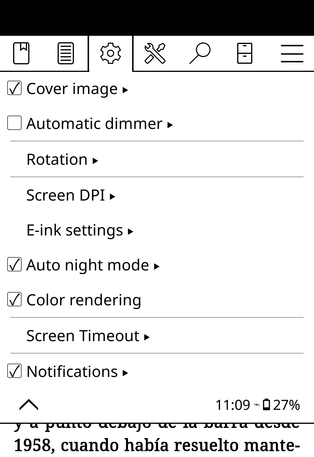 Yes, I know that, as I said I found that feature on Android KOreader version, but not in Kindle PW2's. I'll try to attach here a screenshot of what's there in Gear > Screen menu.