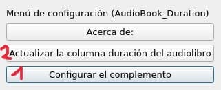 This plugin calculates the duration of the audiobooks or audio files associated with a book (within its folder), and adds that duration in a custom column that we have previously created for this purpose. (It will be a duration column but we can call it whatever we want). At the moment it has no additional functions. Main features Calculate the duration of the books in our library, or of the associated audios that are included in the folders of the selected books. Put that result in a custom column, previously. Special notes Requires calibre 5.xx (python3)(QT5) It needs python3 Compatible with calibre 6.xx (QT6) suported operating systems: -Linux (Pluguin is working) Tested on ubuntu 20.04 -Windows (Plugin is working) Tested on windows 10 Maybe fail if calibre plugin folder doesn't have permisión for all users, i tryied to solve this and i think its solved. -Mac (Plugin is working) Tested on MacOS Big Sur 11.6 Supported languages (This plugin has support for translations): You are free to provide a translation in your preferred language Spoiler: