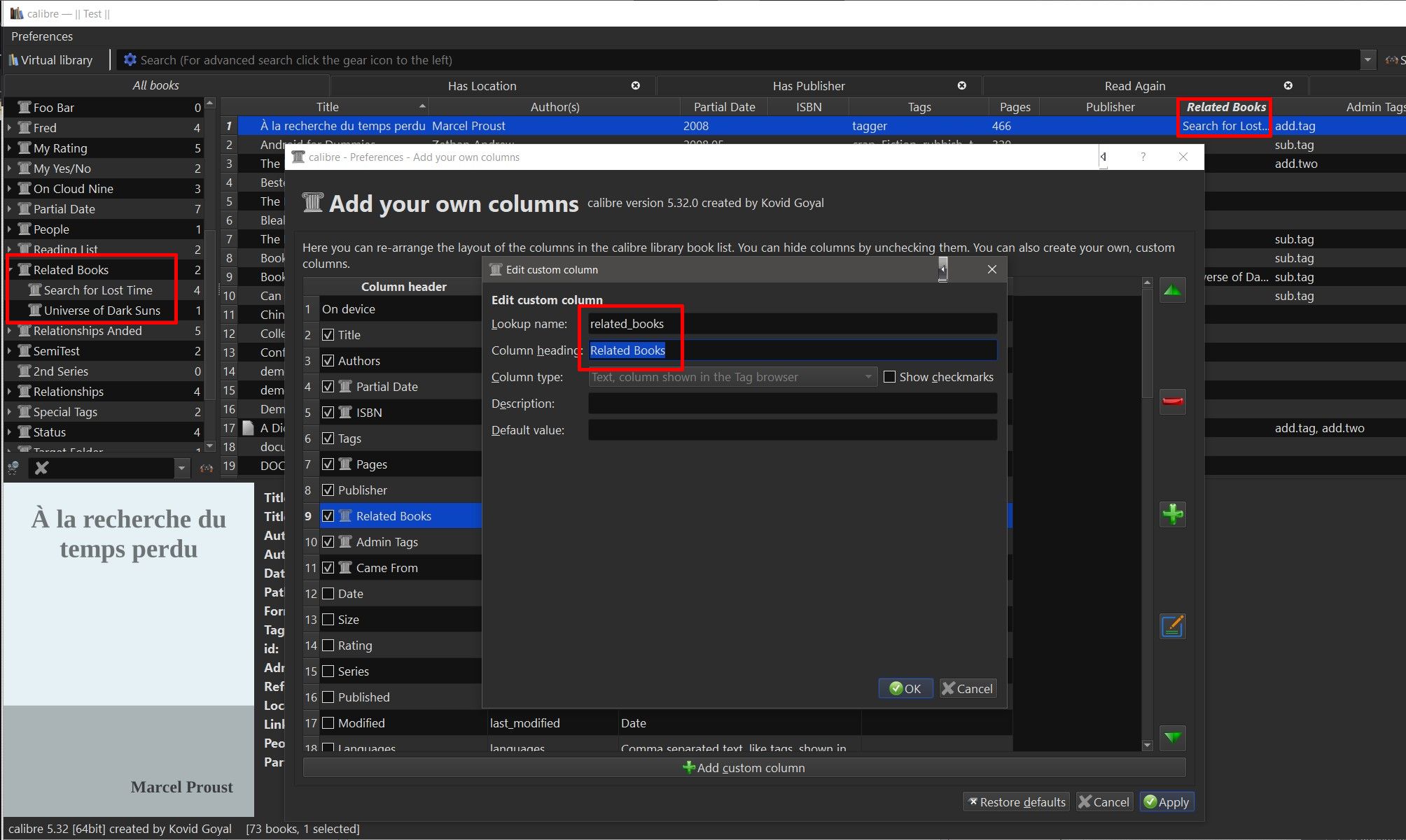 To explain, some novels do not belong to a proper series so, using the default series column is somewhat inappropriate. Likewise, since they do not belong to a series, there is an issue as to what value to put in a custom series column. For example, The Lofty Fierce Consort, Counterattack of the Cannon Fodder Chambermaid , and The Prestigious Family’s Young lady and the Farmer, all belong to the same universe, and have the same author, but they don't have a chronological order, since they take place at roughly the same time. Therefore, using the default series column is inappropriate in this case, since there is no series index. Another example is when there are two separate series by the same author that have an intersection of plot and characters meet/interact with each other. Anyways, what I would like is a custom column that offers Titles or Series (limited to those by the same author) as options. My end goal is to use this column on the content server to create a link in the book details page to related novels. Any advice/ideas are welcome, and fyi, I have some experience with the calibre templates/functions Last edited by zaroz; 11-23-2021 at 08:01 PM. Reason: shared end goal |