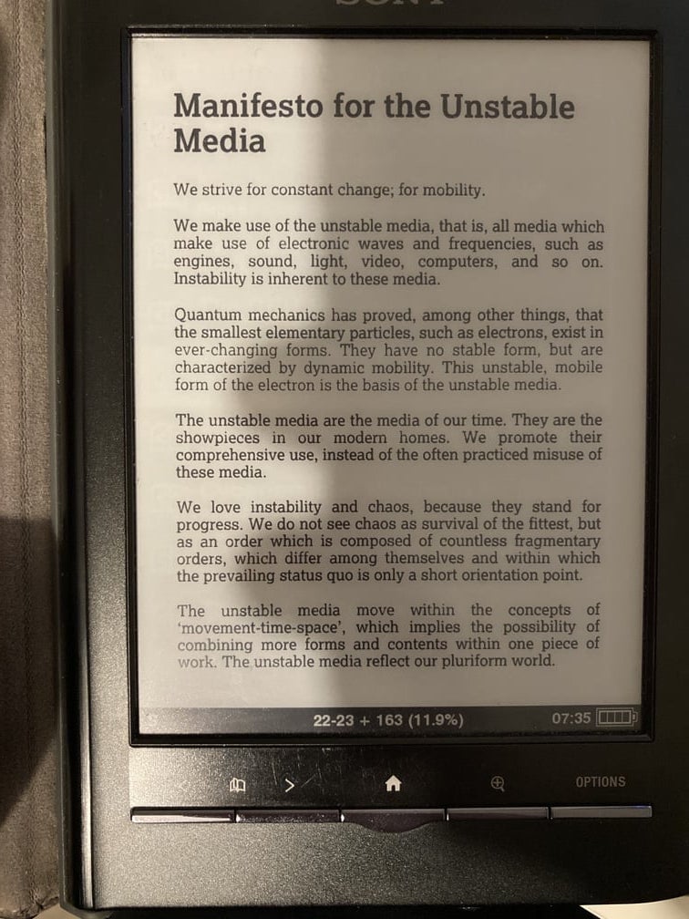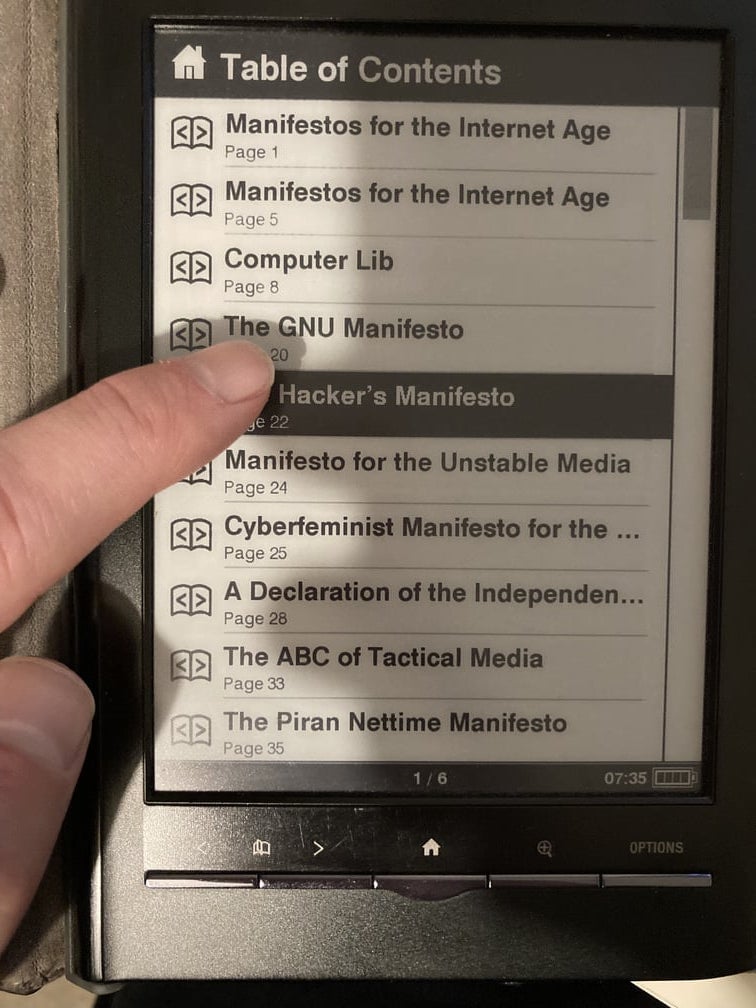 https://github.com/greyscalepress/manifestos On my Mac it is fine, using Calibre viewer, with the TOC items jumping to the correct chapter and page. However, on my Sony Reader the page numbers listed next to items in the TOC are those for the following chapter. Tapping on an item in the TOC jumps me to the page number display, but that's the following chapter. Otherwise the epub opens and reads just fine. I suspect there is a problem with the epub that is causing my Sony Reader to misbehave. Any ideas why this might be? Thoughts appreciated. Thanks! Last edited by gingerbeardman; 12-07-2021 at 02:08 PM. |