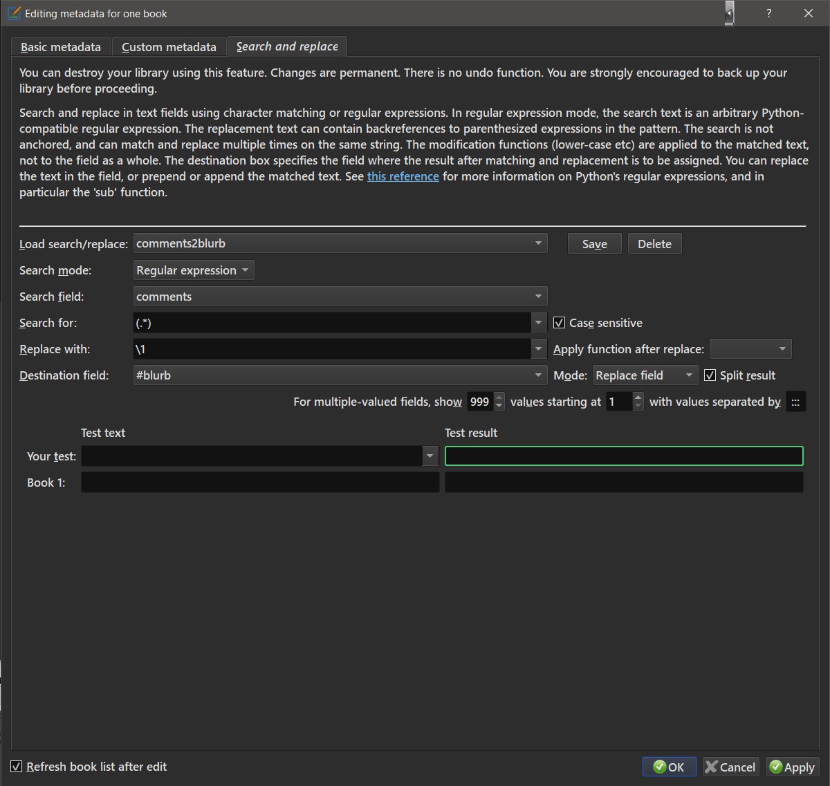 ![]() All my books contain a description/blurb in the comments section of the edit book metadata window. I would like this info to show up in a column in the main interface so that I can see the beginning of the comments or hover over so that I can see the comments instead of having the "show book details" panel open. If anyone can either provide instructions for me or link to forum instructions that would be appreciated. |