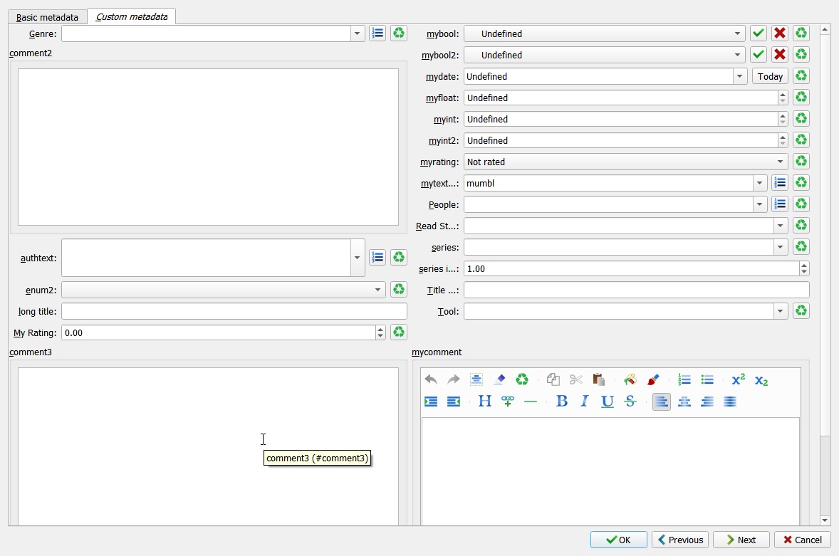 I know I can have custom columns in a separate tab, and that there's a tweak for arranging them in one or two columns, but they're not sufficient. Use case: having multiple instances of the long text editor embedded in the MDE dialogue adds clutter. And it's understandably hard to navigate in-to and out-of them. My preference would be to exclude them and edit those columns from the book list. Psst: I know I can do it by setting the 'editable' column to 0 in the relevant rows of the 'custom_columns' table of the library database. But that's far too far under the covers for me. And I suspect it wouldn't survive the database cleaner. BR |