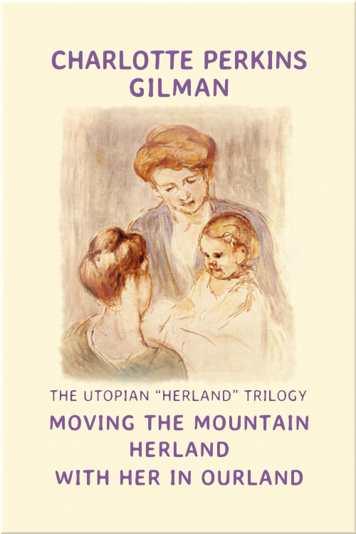 THE UTOPIAN “HERLAND” TRILOGY --------- MOVING THE MOUNTAIN Gilman pointedly calls this book “a short-distance Utopia, a baby Utopia, a little one that can grow.” At a remote location in Tibet, a man in local costume, backed by a group of native people, confronts a woman at the head of an exploratory expedition; there is a sudden sense of realization as the man and woman recognize each other as siblings. Thirty years earlier, at the age of 25, John Robertson had been traveling through rural Tibet and had fallen over a precipice. He was nursed back to health by local villagers, but his memory was deeply impaired until he regained his recollection upon meeting his sister Ellen. He returns with her to the United States, to face a society that is vastly different from the one he knew in his youth. --------- HERLAND Three young American men discover a country inhabited solely by women, who reproduced by parthenogenesis (a form of asexual reproduction), and had borne only girl children for two thousand years; eventually they marry three of the women. The central theme of Herland is defining gender — the roles, how it is socially constructed, and how it is viewed as unchangeable by both genders. It also focuses on motherhood and individuality. --------- WITH HER IN OURLAND This book immediately follows the events of Herland, with Terry, Van, and Ellador traveling from Herland to “Ourland” (the contemporary 1915-16 world). The majority of the novel follows Van and Ellador’s travels throughout the world, and particularly the United States, with Van curating their explorations through the then-modern world, while Ellador offers her commentary and “prescriptions” from a Herlander’s perspective, discussing topics such as the First World War, foot binding, education, politics, economics, race relations, and gender relations. ============ Charlotte Perkins Gilman (July 3, 1860 – August 17, 1935), also known as Charlotte Perkins Stetson, her first married name, was an American humanist, novelist, writer of short stories, poetry and nonfiction, and a lecturer for social reform. She was a utopian feminist and served as a role model for future generations of feminists because of her unorthodox concepts and lifestyle. She has been inducted into the National Women’s Hall of Fame. Her best remembered work today is her semi-autobiographical short story “The Yellow Wallpaper”, which she wrote after a severe bout of postpartum psychosis. ============ Moving the Mountain, by Charlotte Perkins Gilman (1860–1935), was serialized in The Forerunner magazine in 1911, and published in book format in 1911; Herland was serialized in The Forerunner magazine in 1915; With Her in Ourland was serialized in The Forerunner magazine in 1916. The latter two titles were not published in book format until 1979 and 1997, respectively. Cover vignette from a painting by Mary Cassatt (1844–1926). This ebook is in the public domain where copyright is “Life+80” or less, and in the USA. . This work is assumed to be in the Life+70 public domain OR the copyright holder has given specific permission for distribution. Copyright laws differ throughout the world, and it may still be under copyright in some countries. Before downloading, please check your country's copyright laws. If the book is under copyright in your country, do not download or redistribute this work.