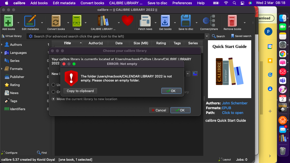 davidb@Davids-VMMac calibre % mkdir "Calibre Library 2022" davidb@Davids-VMMac calibre % cd "Calibre Library 2022" davidb@Davids-VMMac Calibre Library 2022 % ls -alr total 0 drwxr-xr-x 3 davidb staff 96 2 Mar 08:32 .. drwxr-xr-x 2 davidb staff 64 2 Mar 08:32 . davidb@Davids-VMMac Calibre Library 2022 % |