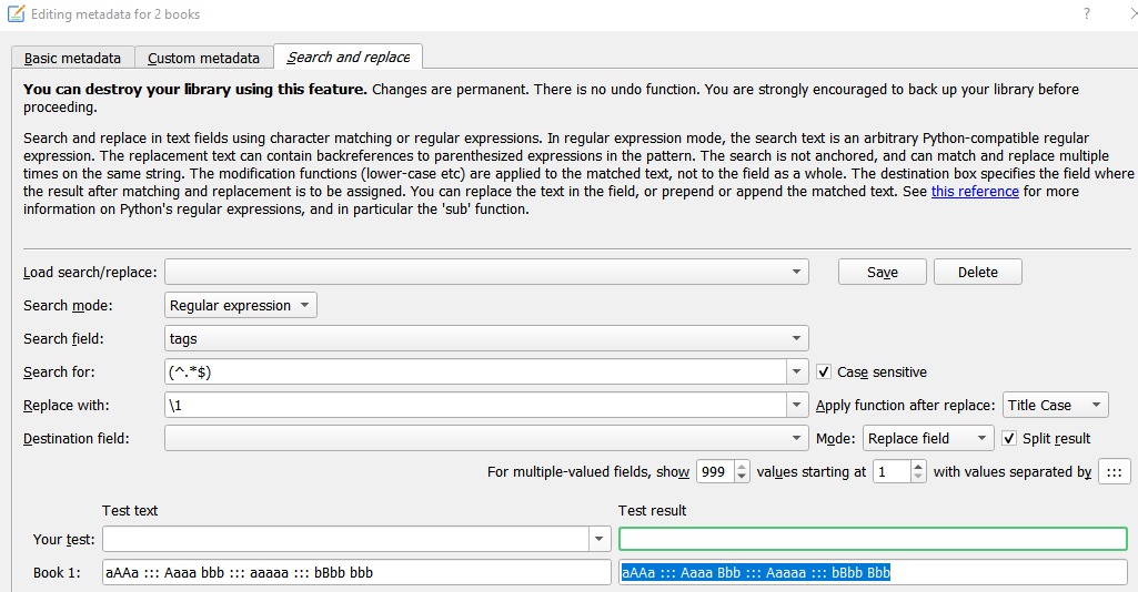 aAAa ::: Aaaa bbb ::: aaaaa ::: bBbb bbb => aAAa ::: Aaaa Bbb ::: Aaaaa ::: bBbb Bbb A nuclear option is to change all tags to lower case, then in a second run change all tags to title case, then in a third pass fix the ones now broken. It is hard to imagine that this is a good idea, but heh, what do I know? ![]() In general, regular expressions in calibre have trouble dealing with matching case because calibre tries very hard to ignore it. Search & replace can deal with case but it is hard to handle words like VoIP that are intentionally mixed-case. The difficulty is increased by the rule complexity: calibre's titlecase() function tries very hard to handle (English) punctuation and acronyms. Last edited by chaley; 03-26-2022 at 04:30 PM. |