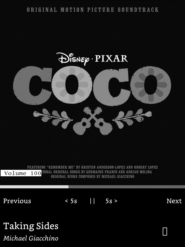 I have been planning to build a music player for it with album art and everything, and here it is!! I'm proud to present Buck, a music player with ID3 (and thus album art) support along with album based sorting ===== QUICK NOTE ===== It should theoretically work with any e-ink device since I only call FBink and a pre-built mplayer binary, but I can't test it since I don't have other devices. If you have other devices, I'd love to hear how it goes! =================== INTRODUCTION E-ink devices have traditionally been only for reading... well no more! Buck is a fully-fledged music player for e-ink devices. Features: - Using the generated Table of Contents, pick the song you wanna play - Afterwards, in the search bar, there are two commands you can do ;b - to open up the GUI ;b <track number> - to play up the track of your choice - Here's what the GUI looks like Tap near the top to control volume and the bottom right to close the UI! ** Playlist support is not planned at the moment! I'm not exactly sure how it would work, and I don't personally use playlists INSTALLATION Requirements - USBnet - KUAL In the root directory of the GitHub repository is a folder named `buck`. That's everything you'll need. 1. Move the buck folder to your /mnt/us/ folder Folder structure: - /mnt/us/buck/buck - /mnt/us/buck/buck-cli - /mnt/us/buck/buck-cli.sh - /mnt/us/buck/kual_buck - /mnt/us/buck/assets - /mnt/us/buck/bin - /mnt/us/buck/lib 2. The KUAL extension - The /mnt/us/buck/kual_buck folder is the KUAL extension, move it to /mnt/us/extensions 3. The Search Commands