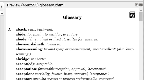 I originally had every testament/book/chapter as its own TOC item, and all in, that came to 1430 items (combination book of OT, NT, and Apocrypha). So instead I took out the chapters and put those as links on the individual book covers and I think it looks/functions great like this. I couldn't find a readable digital copy of this translation (font readability+eyesight issues), so I decided to undertake my own massive data scraping operation to pull all the data together and assemble my own epub out of it. Due to the translation from 14th century Middle English to modern English, there's a pretty massive glossary of terms that I need to reference a lot.. hence I was hoping to give myself some quick links to make it as easy as possible to reference the glossary. I think I will just add a shortcut to the glossary on each chapter title, as well as on each of the book covers. Quote: