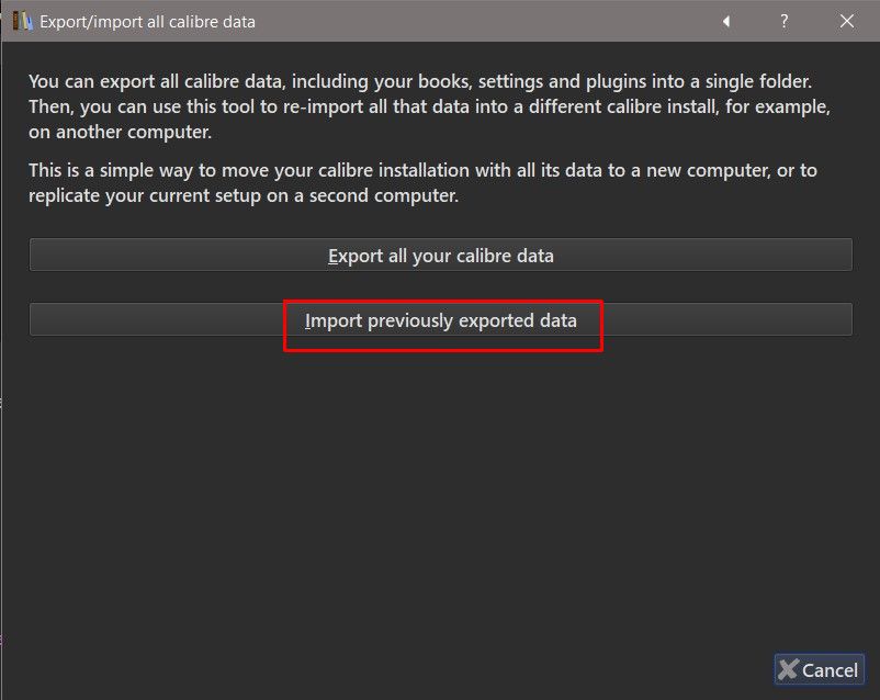 thanks! but now i'm getting this error:calibre, version 5.42.0 ERROR: Failed: Failed to import data. Click "Show details" for more information. Traceback (most recent call last): File "calibre\gui2\dialogs\exim.py", line 138, in run_action File "calibre\utils\exim.py", line 339, in import_data File "calibre\db\cache.py", line 2550, in import_library PermissionError: [Errno 13] Permission denied: "C:\\Program Files\\Calibre2\\Jun's Library\\metadata.db" |