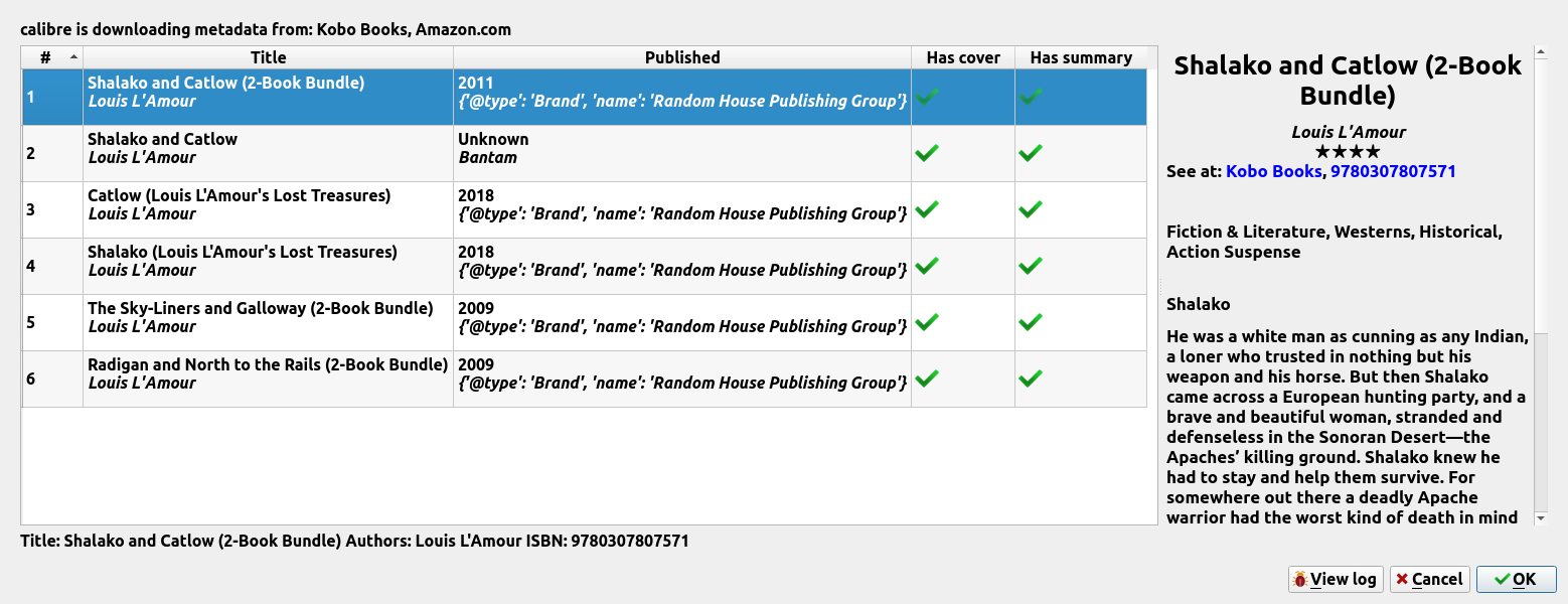 I am seeing some strange results when performing a "Download metadata" that I have never seen before. Prior to today, everything appeared normally. Now, all returns from Kobo result in the format shown in the screenshot below. Amazon/Google remain normal as displayed in two entries. I'm guessing Kobo has changed something on their end.