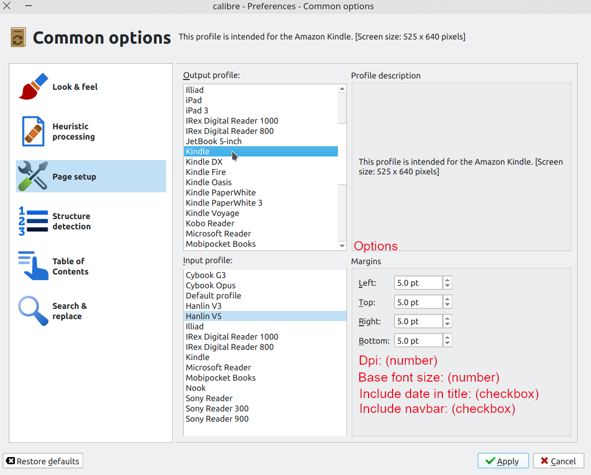 I do not understand the logic behind this. 1) Why is this set through profile? I*own both a Kindle (old Paperwhite) and a Pocket book (Inkpad 741 Color) and I do not see why Kindle does not need them and Pocketbook does. Pocketbook knows how to use a TOC, Kindle knows how to follow the links in the navbar. What is the difference? 2) Why output format has anything to do with that is also a mystery to me. 3) I love Calibre, but puting its name to every article downloaded feels more like spam than anything else. (I know, I could edit the source code, but that is nor really the point). 4) I can see that it can be a matter of preference - some people prefer navbars, some people, like me, just find them super annoying. I*do not mind them being on by default. However, why is avoiding them governed by such an obscure mechanism? 5) A further problem with this is that this setting is not atomic. I like the title of the downloaded news to have date in it. Output profile set to mobi causes that to not happen. So I can either have no navbars or date in the title, but not both. 6) Another mystery to me is if the output profile changes anything else. It feels weird and counter-intuitive to set it to kindle even though I*use Pocketbook. This seems to be coming up now and then: https://www.mobileread.com/forums/sh...d.php?t=133714 https://www.mobileread.com/forums/sh...ad.php?t=92371 https://bugs.launchpad.net/calibre/+bug/1870580 https://bugs.launchpad.net/calibre/+bug/1744057 (and I am sure there is more, I*definitely asked about it years ago but cannot find it) Last edited by sup; 06-30-2022 at 04:01 AM. Reason: There was a mispaste in the title |