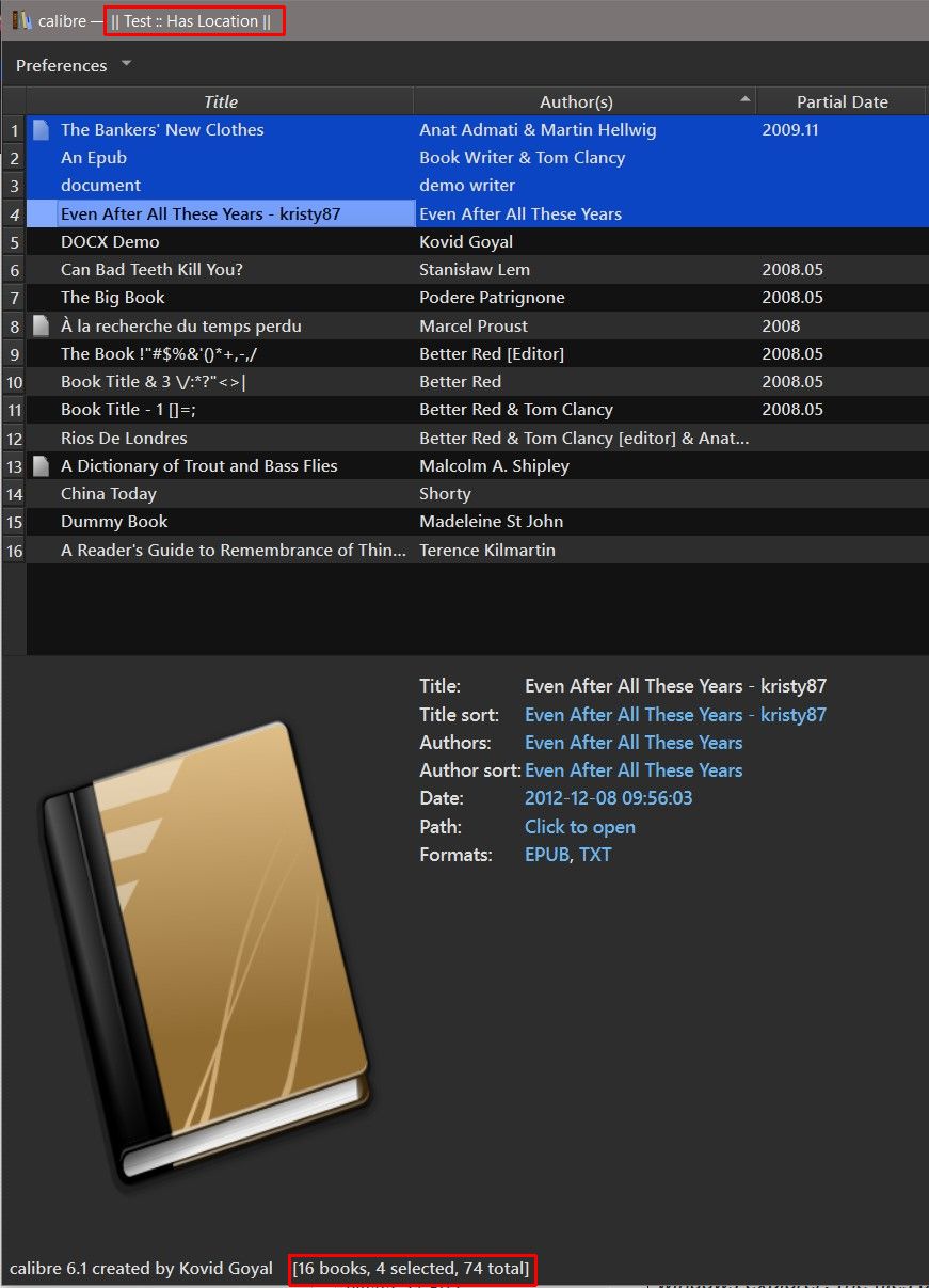 ↑ ↑ ↑ ✔  What we need to know is what's in the red-boxes : The Title Bar tells me I am looking the physical library Test virtual library Has Location. The Status Bar tells me the Has Location virtual library has 16 books, of which 4 are selected, and that the Test physical library has 74 books. BR |