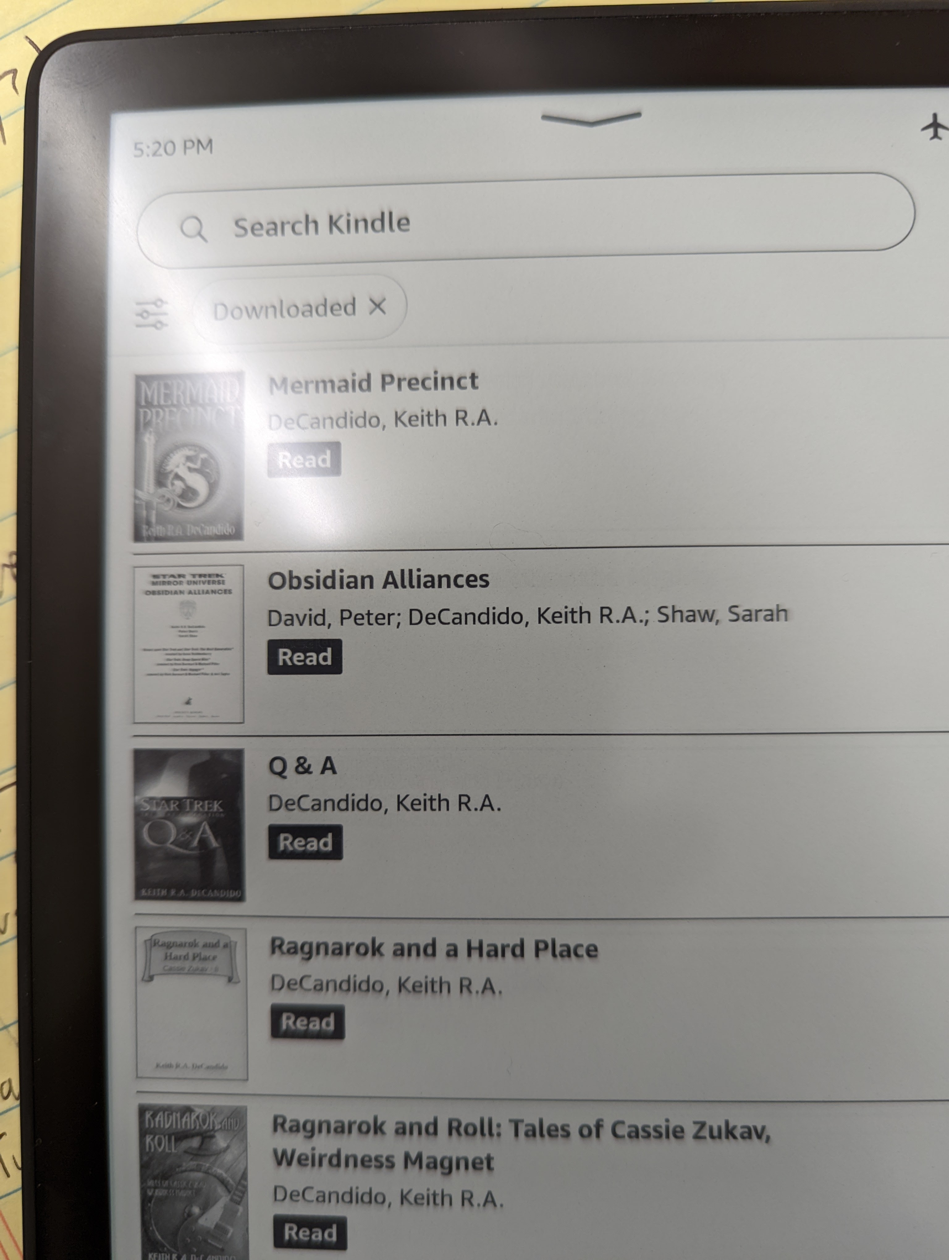 Relatedly, it looks like Kindles finally sort by title within an author, but the author_sort ordering can cause some remarkable weirdness...a book that Calibre has as "Keith R.A. DeCandido & Peter David & Sarah Shaw" (with appropriate author_sort in Calibre) will show up in the middle of my collection of Keith DeCandido's books, but with Peter David's name first. See attached.