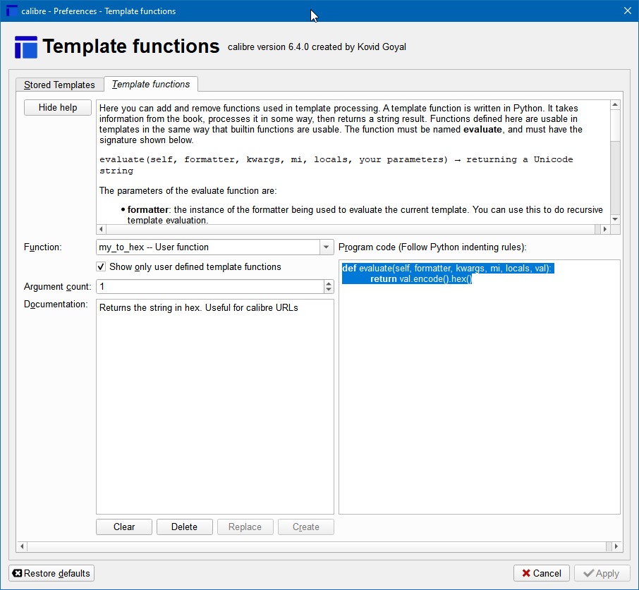 def evaluate(self, formatter, kwargs, mi, locals, val): return val.encode().hex() Assuming you used my_to_hex above, the template is Code: