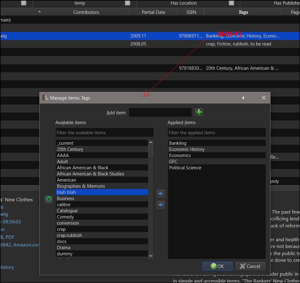 If you press Shift+F2 on a Tags cell in the Book list, the Manage Items: Tags dialogue will pop, viz: Double clicking an item on either side will move it to the other side. There's also the Category editor (Tags) dialogue, which you can access via the Manage Categories tool which can be added to toolbars and menus, or by right clicking a Tag in the Book details and Tag browser panels. BR |