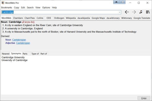 Anyone reading on a PC should take a look on the WordWeb program It has the distinct feature that it can read the word under the mouse cursor with a hot key combination and then activate the program. In the picture below I have activated the program by doing a ctrl + rightclick on the word "Cambridge". You can now select to search for "Cambridge" using any dictionary tab. The dictionary tabs can be user defined in the pro version. I am not in any way affiliated with WordWeb. Last edited by svenlind; 11-17-2022 at 09:45 AM. Reason: spelling |