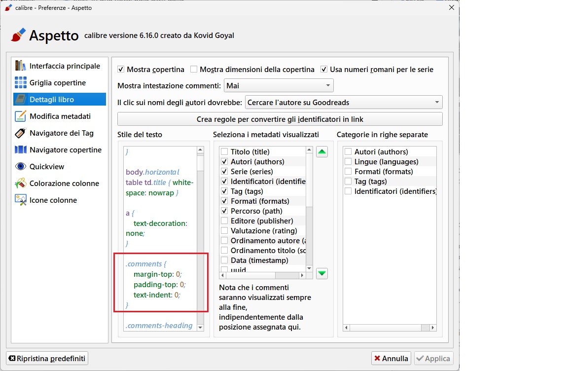 after I upgraded Calibre to version 6.16, the lines I entered in Preferences => Look & feel => Book details disappeared and, if I re-enter them, they disappear every time, see fig.1 and fig.2. Can anyone tell me why? Thanks and bye |