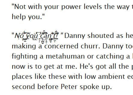 I've been reading a lot of fanfic on my Clara HD, and some authors will use "zalgo text" for spooky dialog, but it doesn't render right on my device. Typically I use Palatino as my reading font, but the rendering is an absolute mess despite having Noto Serif set as a supplemental font (see the first attachment). When I set my reading font to Noto Serif it renders just fine (see the second attachment). For reference the third attachment is how it looks in Firefox (original work is at https://archiveofourown.org/works/28092402).