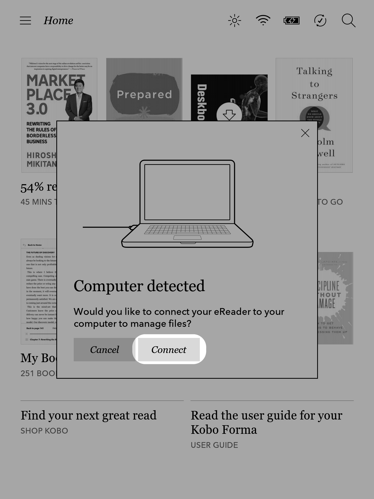 When you connect your Kobo to your computer, does the Kobo display a screen like the one in the attached image? |