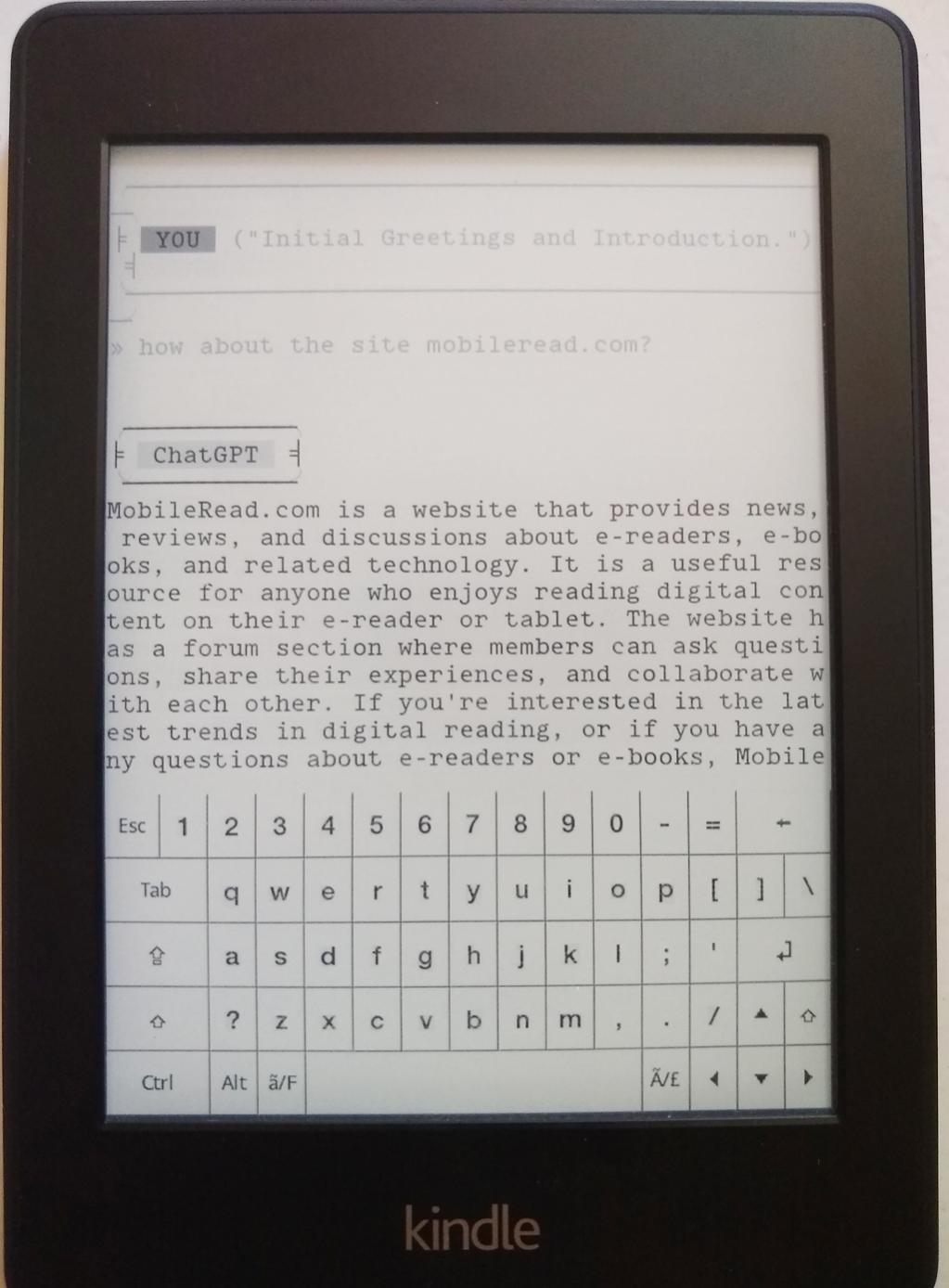 Is it possible to develop a ChatGPT client for Kindle? While there are numerous ChatGPT apps available for mobile and desktop devices, I have yet to find one that is compatible with the Kindle. Although the Kindle does have an experimental web browser mode, it is unable to properly render the ChatGPT webpage, resulting in a blank page when attempting to access "chat.openai.com." It would be greatly appreciated if someone could create a ChatGPT client that is compatible with the Kindle, whether it be in the form of a KUAL extension or any other suitable method. Last edited by cdhigh; 05-07-2023 at 09:41 AM. |