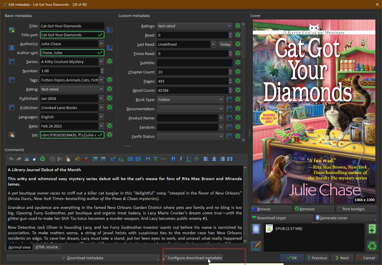 I installed Calibre 6.17 on my new laptop. When I click on the button ‘download Metadata’ the description doesn’t automatically fill the box ‘Comments’ (see attached). On my old laptop it worked fine.