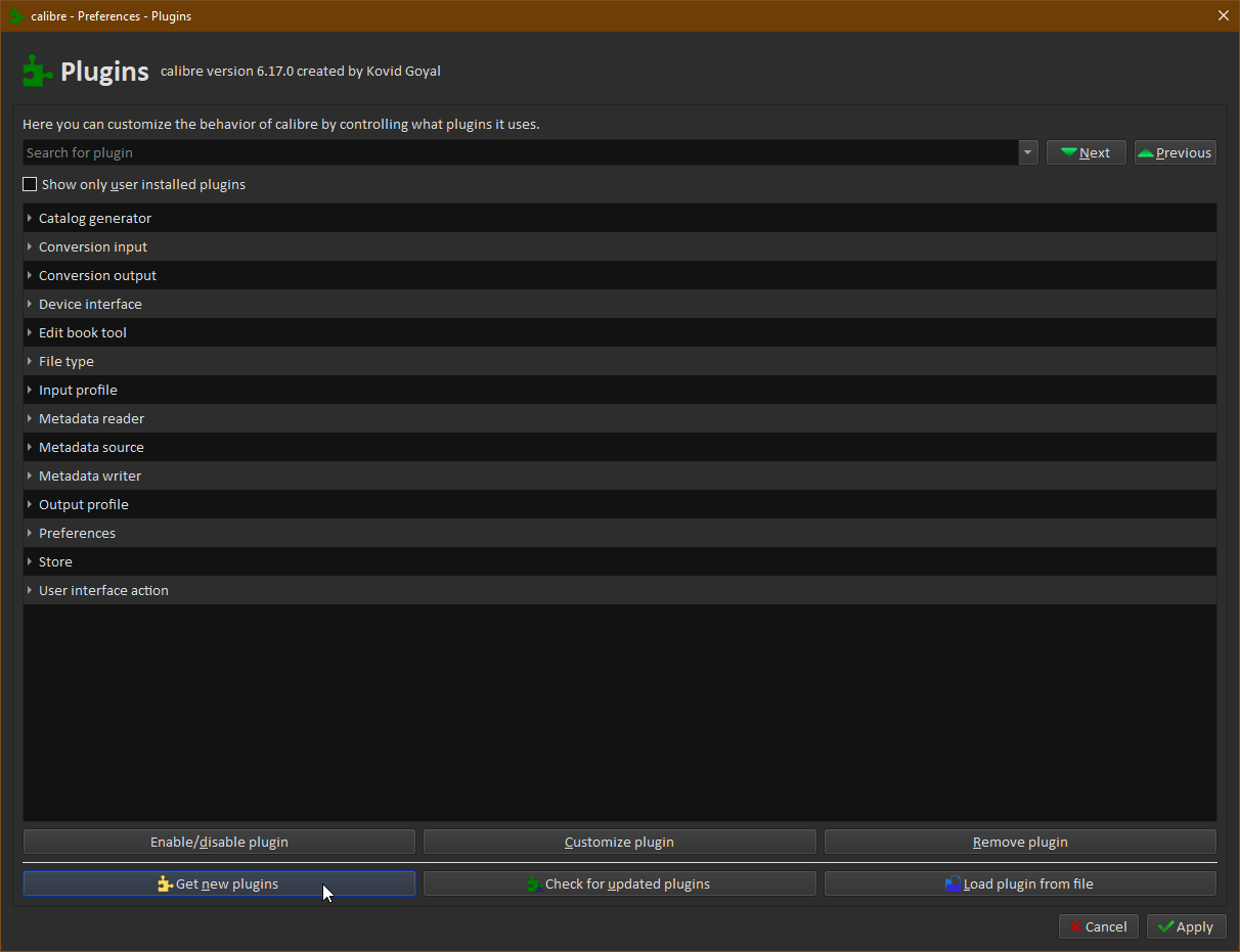 Scroll down to 'Metadata Source Plugins' to see the available ones. Note that some may be out of date and don't work on newer versions of Calibre. Last edited by ownedbycats; 05-07-2023 at 02:09 PM. Reason: I forgot the second screenshot |