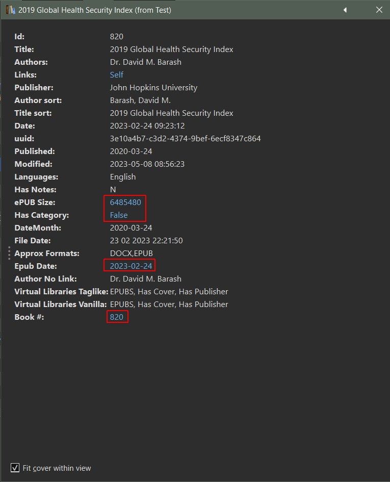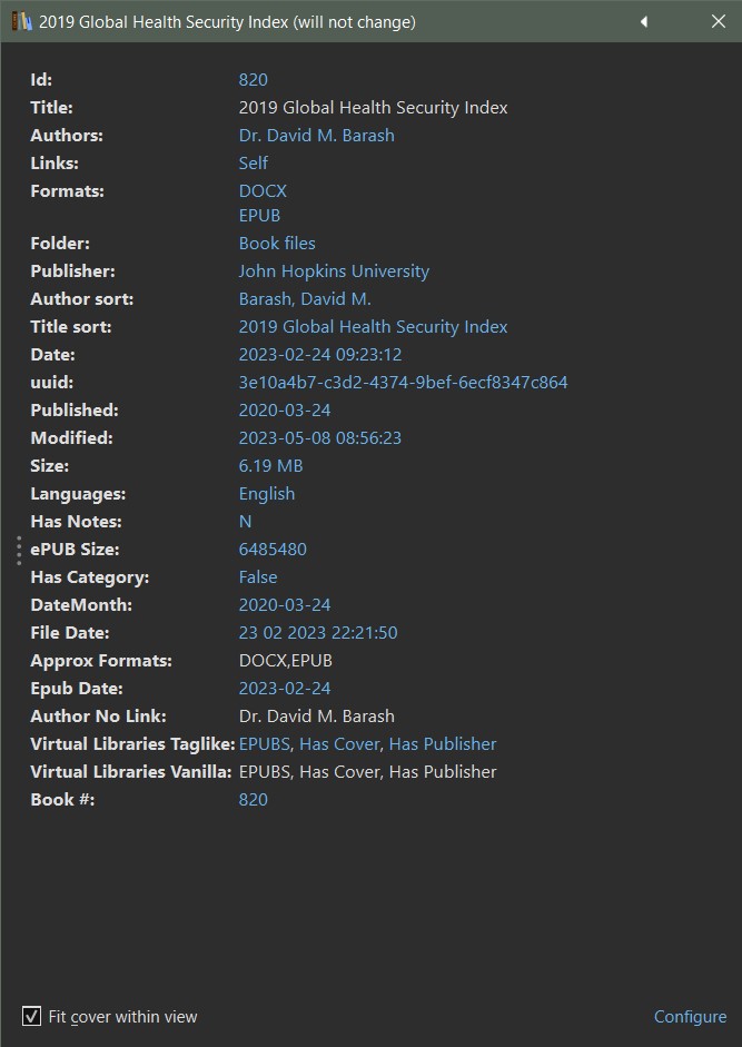 Id: 820 Title: 2019 Global Health Security Index Title sort: 2019 Global Health Security Index Authors: Dr. David M. Barash Author sort: Barash, David M. Author No Link: Dr. David M. Barash Links: Self Virtual Libraries Vanilla: EPUBS, Has Cover, Has Publisher Virtual Libraries Taglike: EPUBS, Has Cover, Has Publisher Date: 2023-02-24 09:23:12 Folder: Book files Formats: DOCXEPUBPDF Published: 2020-03-24 Publisher: John Hopkins University uuid: 3e10a4b7-c3d2-4374-9bef-6ecf8347c864 Modified: 2023-05-08 08:56:23 Size: 6.19 MB Languages: English Has Notes: N ePUB Size: 6485480 Has Category: False DateMonth: 2020-03-24 File Date: 23 02 2023 22:21:50 Approx Formats: DOCX,EPUB Epub Date: 2023-02-24 eSize: 6485480 Book #: 820 Title: 2019 Global Health Security Index Authors: Dr. David M. Barash Links: Self Formats: DOCX, EPUB, PDF Published: 2020-03-24 Publisher: John Hopkins University Languages: English File Date: 23 02 2023 22:21:50 Approx Formats: DOCX,EPUB,PDF Epub Date: 2023-02-24 eSize: 6485480 Book #: 820 Then I can paste it into anything, such as a text email, and cut out the stuff I don't want with relative ease. I suggest Book details settings be updated with something like this: Default would be All links (i.e. status quo), the Advertised links option is what is provided by the calibre://book-details link popup, and the Plain text only option is the same after the <a href…></a> markup is stripped. BR |
