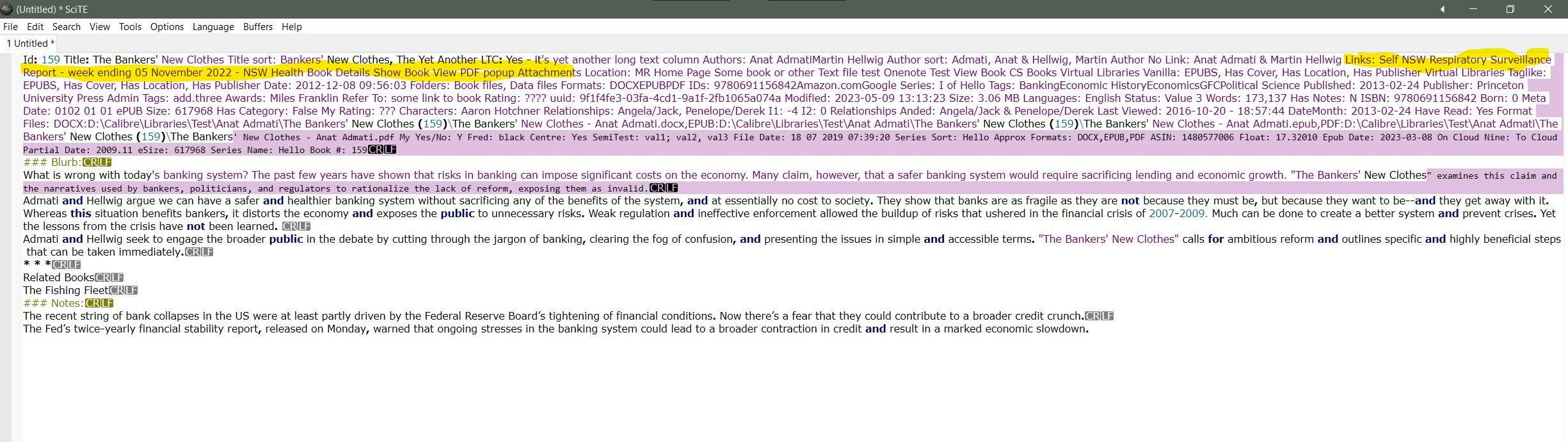 Same in Notepad++, SciTE, and Word (with no formatting on paste). Here's an example of what it looks like in SciTE - with Wrap on. Blurb and Notes are long text columns with header on top, the Links column, which I've highlighted, is also a long text column with header to the side. BR Last edited by BetterRed; 05-09-2023 at 12:33 AM. Reason: forgot the screen shot |