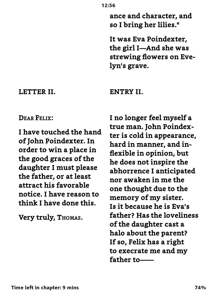We were both reading that book on a Sage and decided in this case since you can only read one thing at a time and it's not a translation, putting the letter then the thought/narration worked better. But absolutely for parallel translations (Hebrew/Latin/Greek/Arabic in one column and English alongside) or say Chaucer and modern English. Or Beowulf or Old Irish MSS with Modern Irish and/or English (need 3 columns in landscape?). |