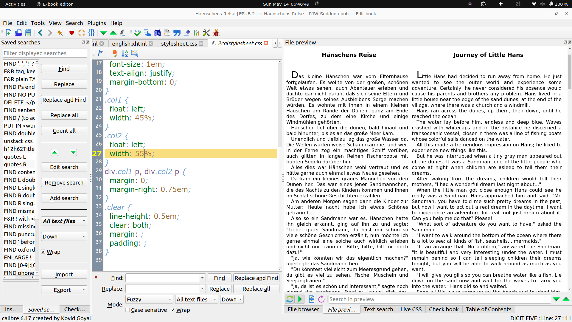 It's not very difficult to code an epub like the one I posted, even with a 150K document. The hard part is to alternate paragraphs (to style the paragraphs is a piece of cake); in LibreOffice or Word, is possible to write a macro in OOo Basic (or VBA) to do the job of alternating paragraphs (from two different documents –one document contains the text for the left column and the other contains the text for the right column— into a new one). Quote: